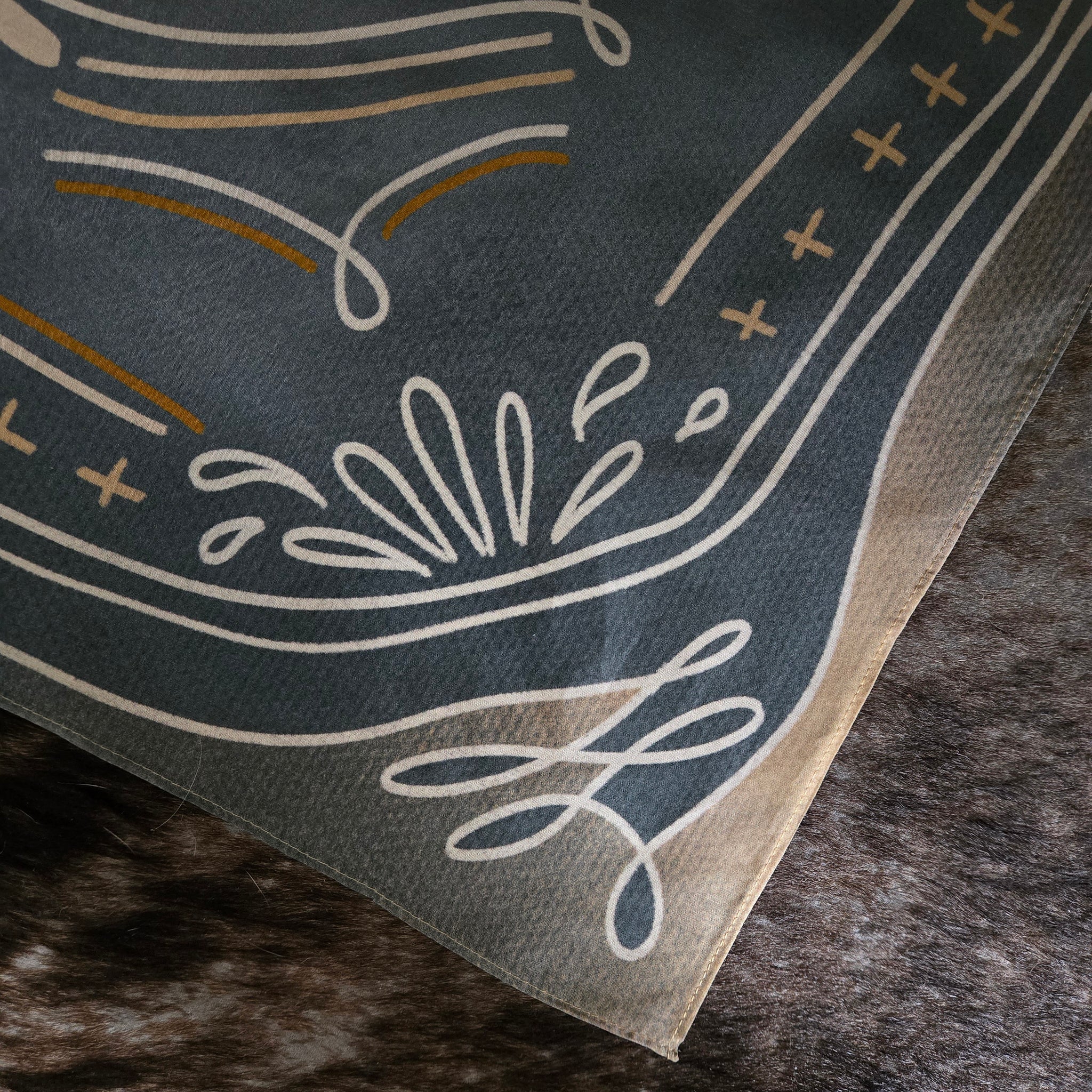 Inspired by western heritage and designed in Oregon, this western silk scarf blends wild west spirit with effortless style. Made from a soft and luxurious silk and tencel blend. Contemporary bootstitch designs grace each corner with a directional cross in the middle.