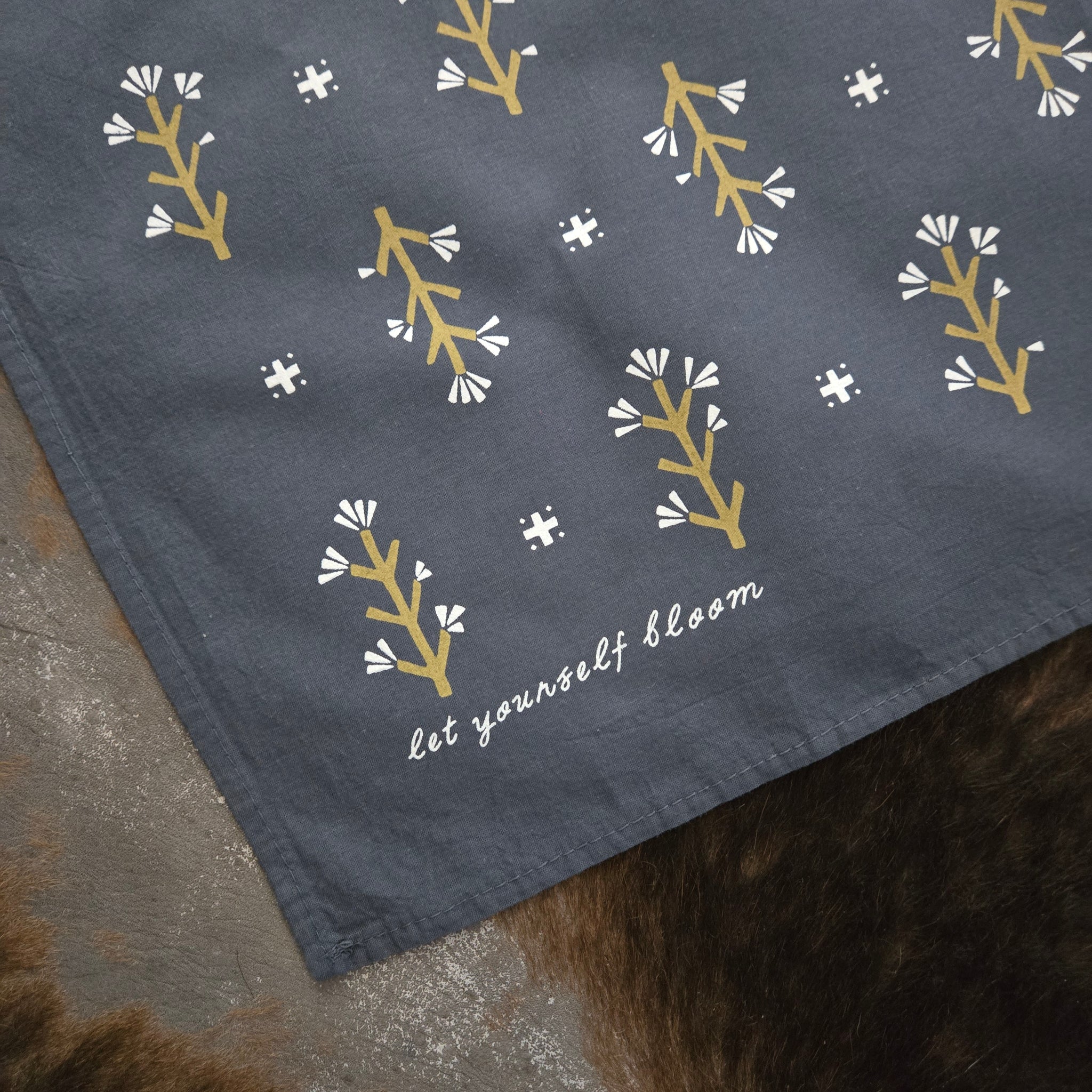 The perfect (and obligatory) Western Accessory. Almost a survival piece in today's world. Hand dyed and printed with a design featuring all over floral blooms and a single horseshoe. With the saying 'Let Yourself Bloom', this is a wearable talisman signifying self confidence and the ability to accept personal growth.