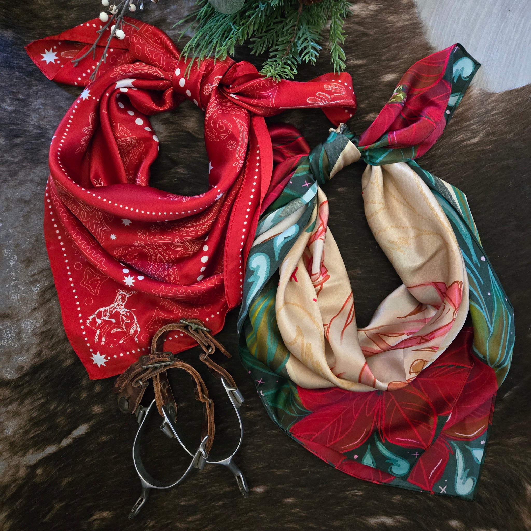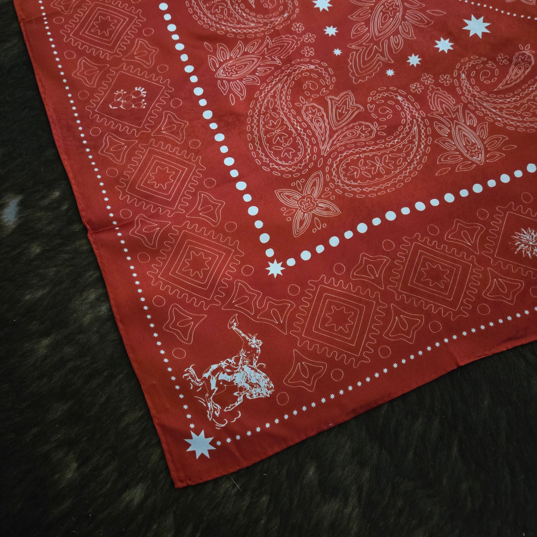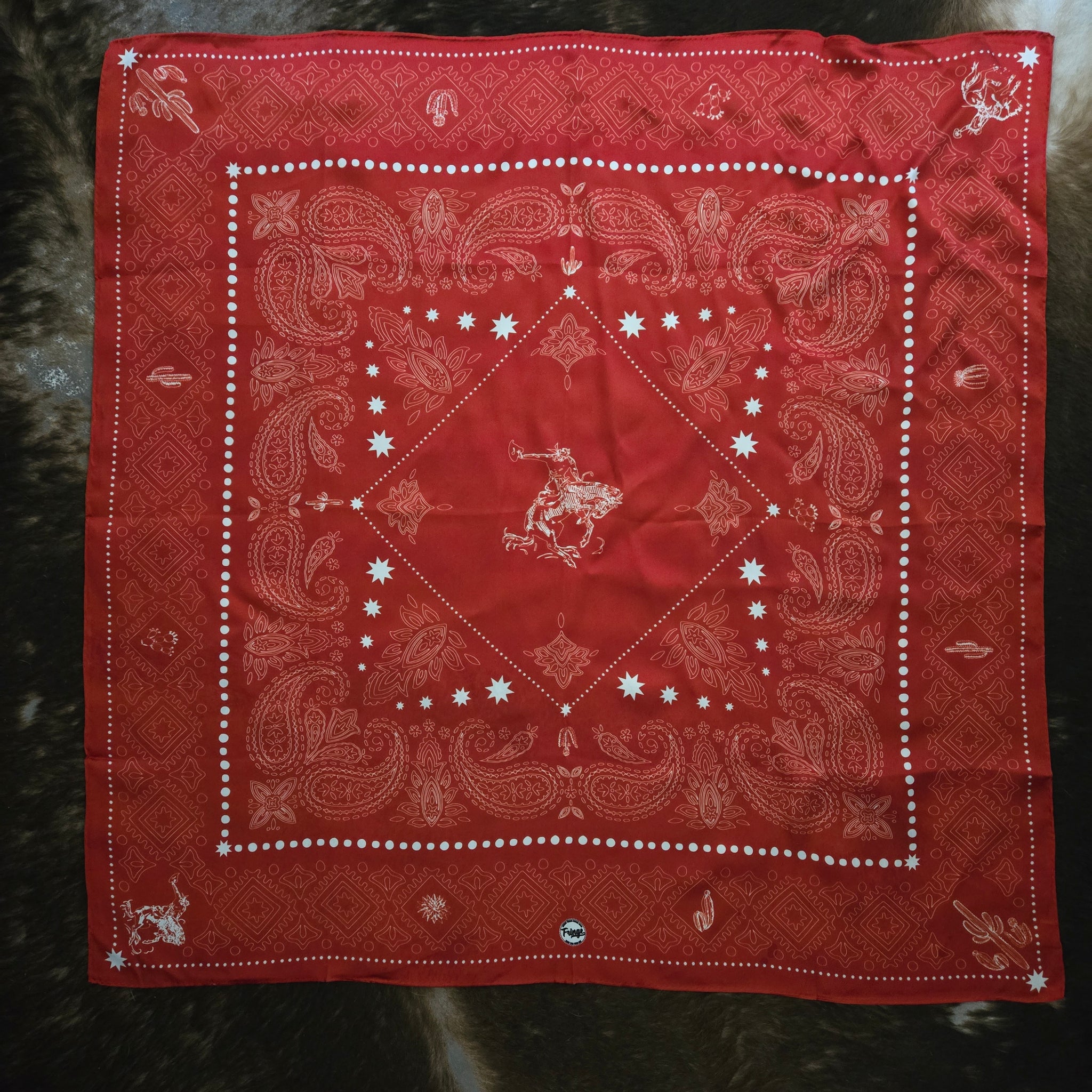 Our favorite traditional bandana reinterpreted in silk. Featuring a Bucking Bronc in the center surrounded by a paisley design. The corners sport cowboys & saguaro cacti. A vintage inspired design you'll definitely want to add to your collection.