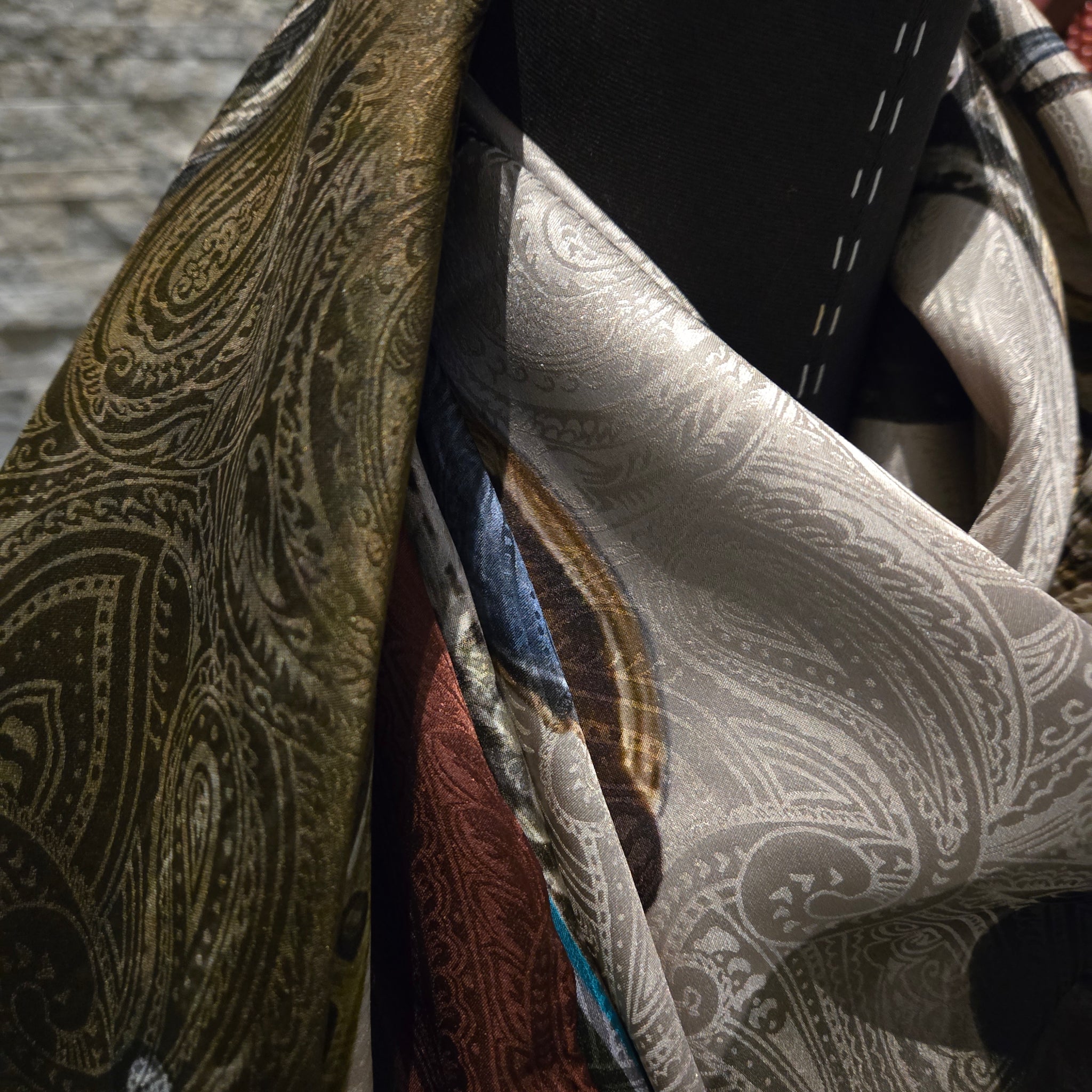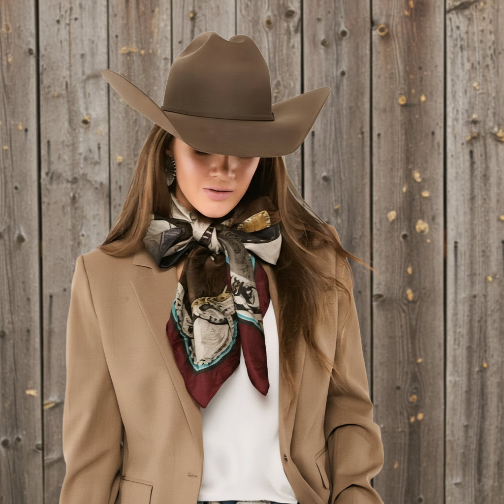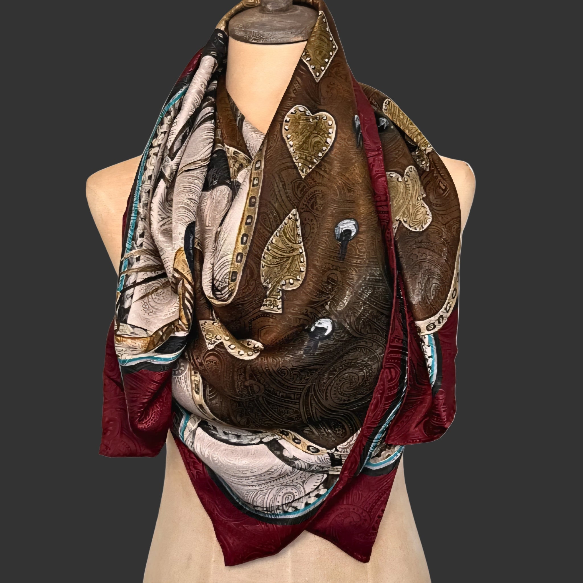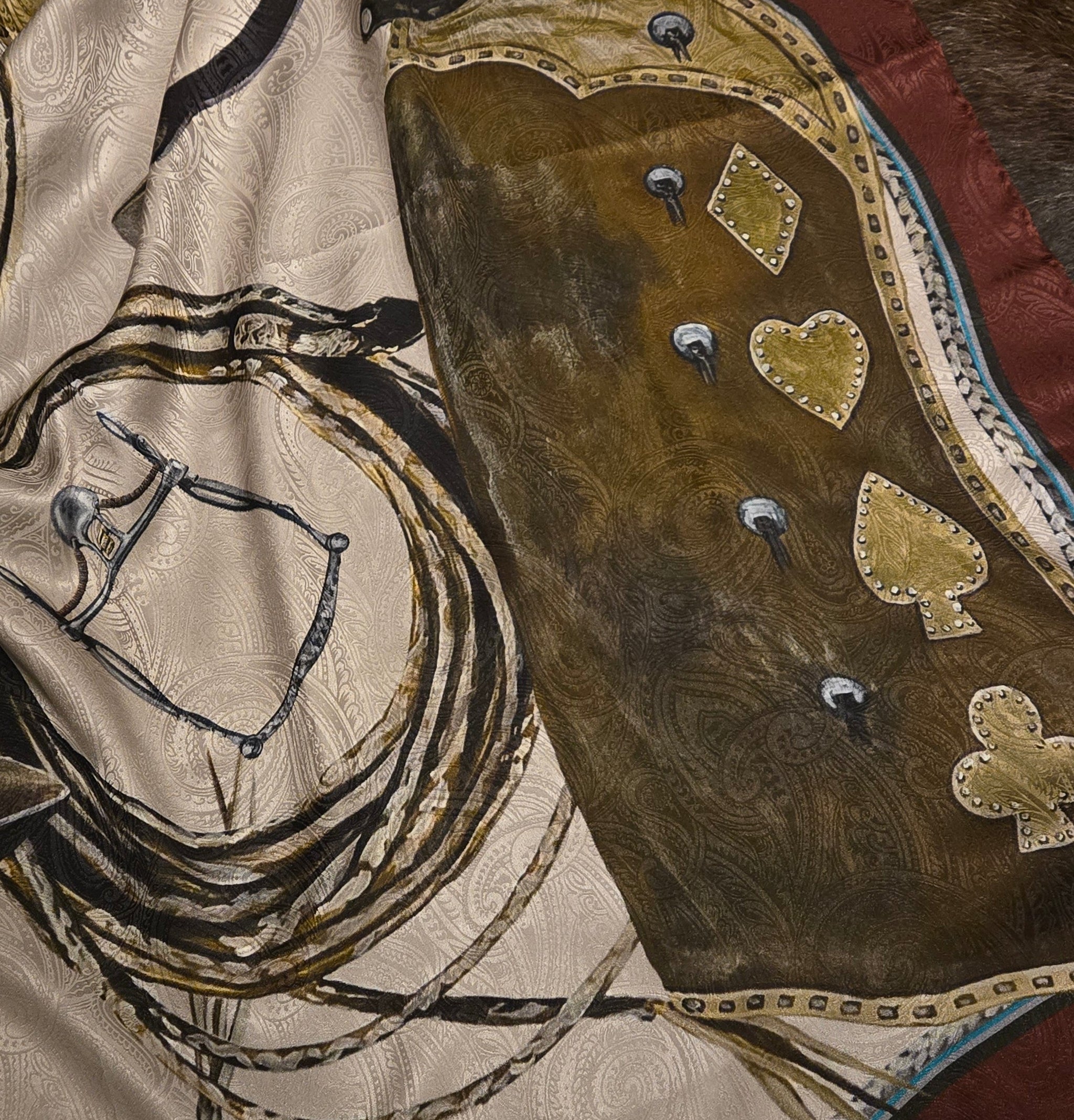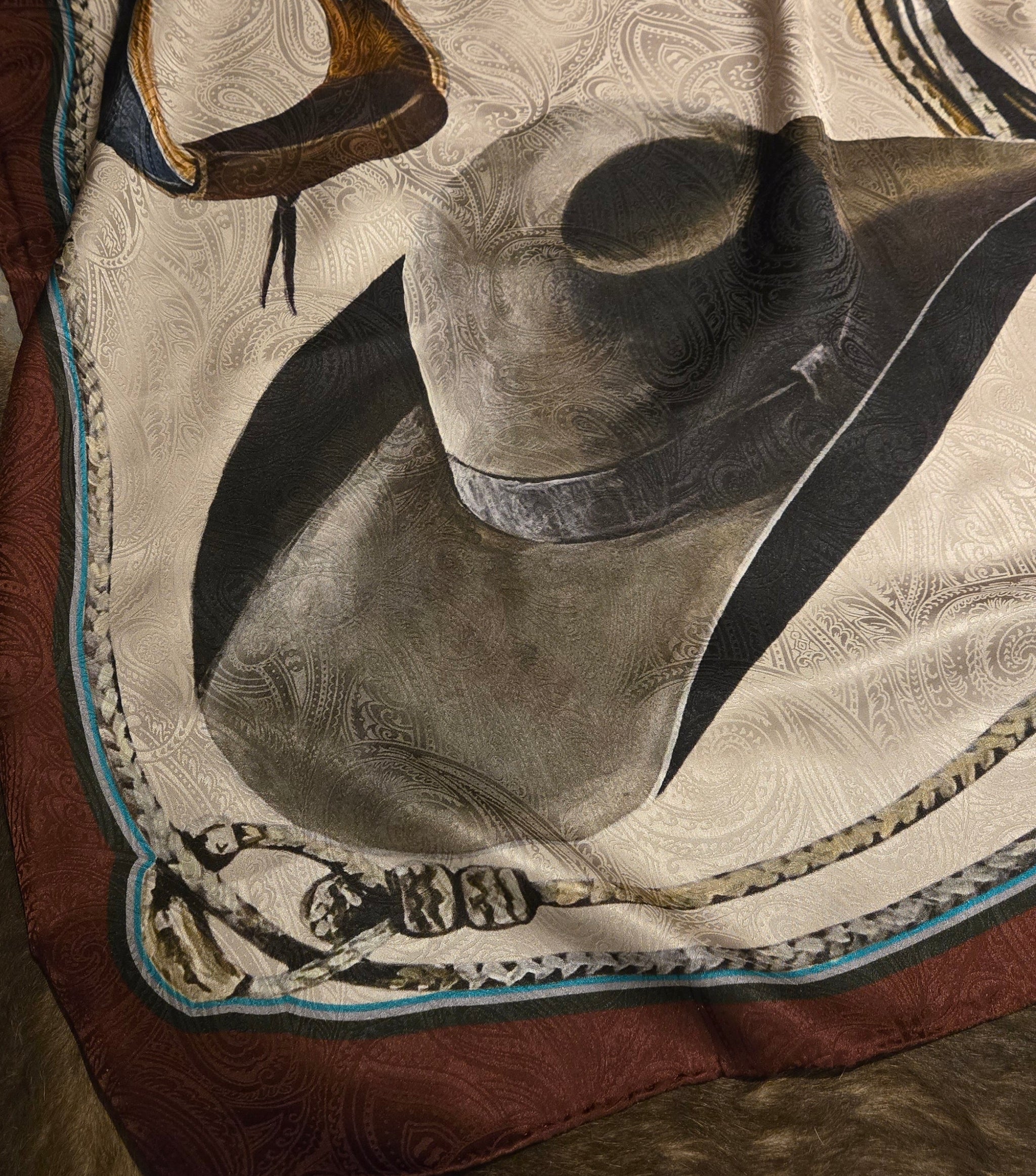 The luxury Wild Rag of the West from our friends at Fringe Scarves. We are proud to represent the Blue Label collection, an exploration of craftsmanship and texture. The Bridles scarf features the subtle communication between horse and rider. Its intricate design showcases an elegant arrangement of reins, headstalls, and rawhide romals. Printed on 2 sides with a navy border on a silk paisley jacquard.