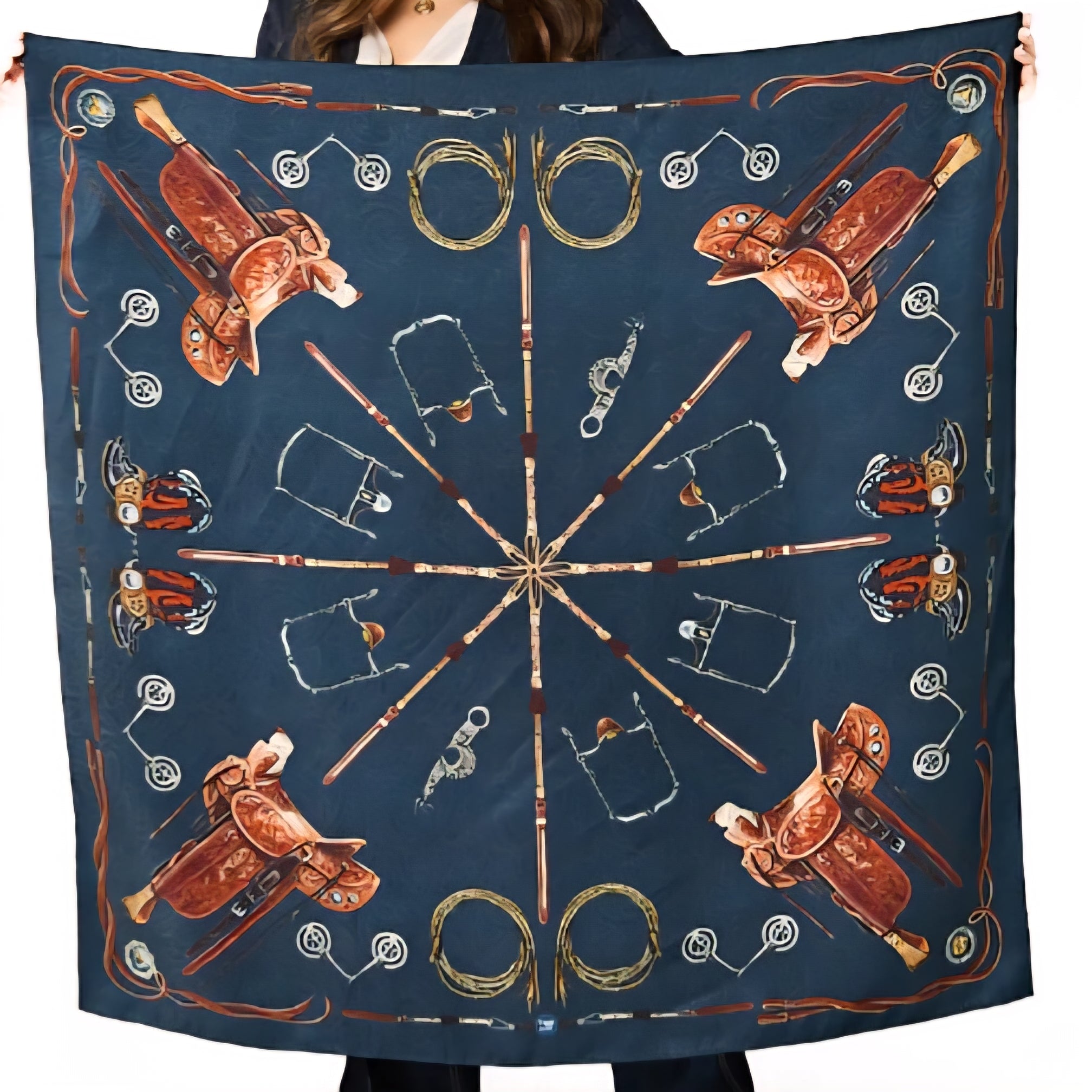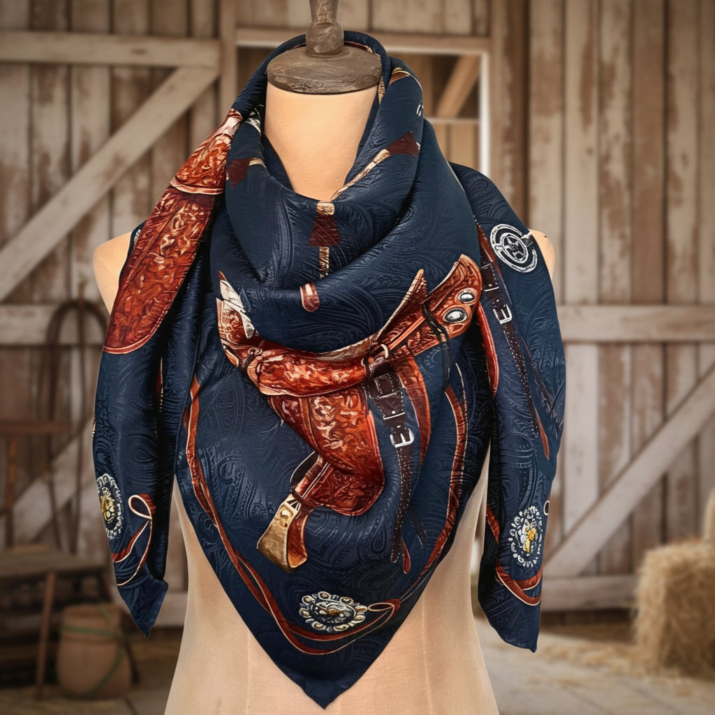 The luxury Wild Rag of the West from our friends at Fringe Scarves. We are proud to represent the Blue Label collection, an exploration of craftsmanship and texture. The Ranch Gear scarf features a celebration of the tools that shape life on the range - each piece telling a story of craftsmanship, discipline, and devotion to the work. Saddles, bits, ropes, and spurs form a bold, circular composition that feels both grounded and refined. Printed on 2 sides on a navy silk paisley jacquard.