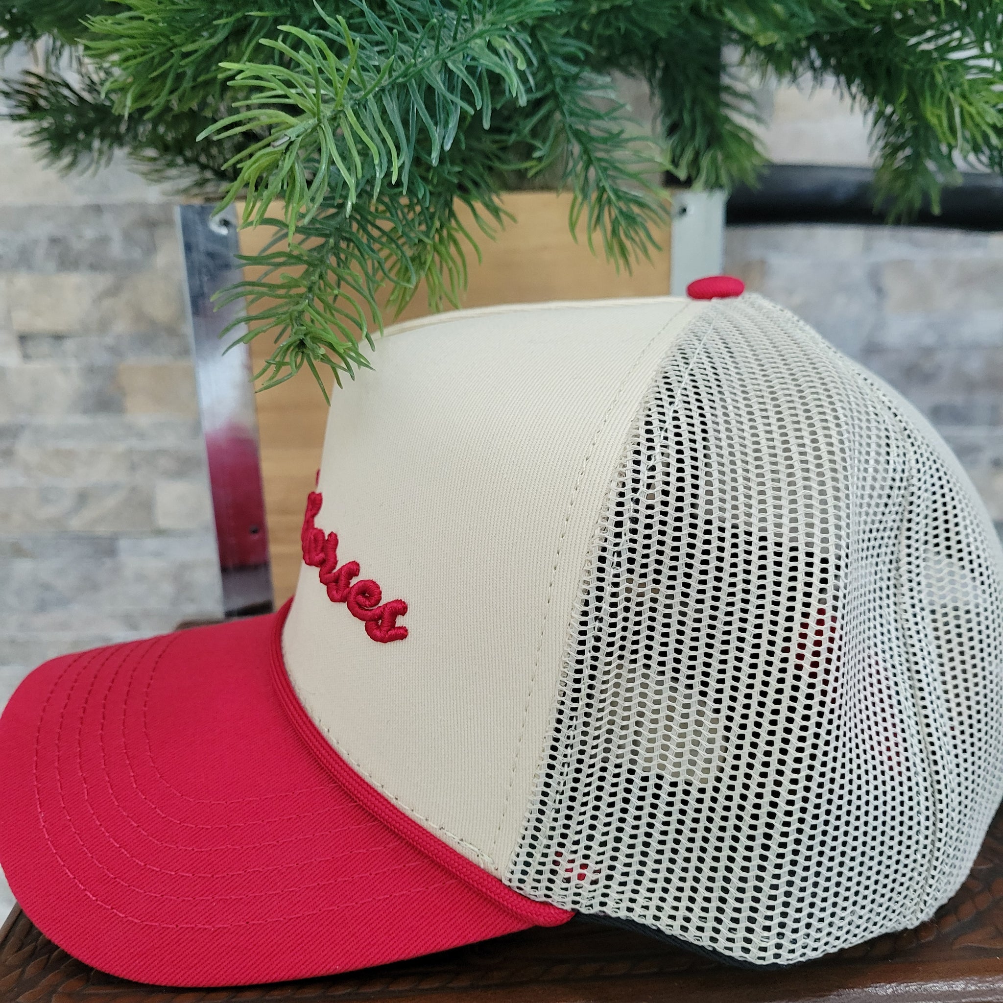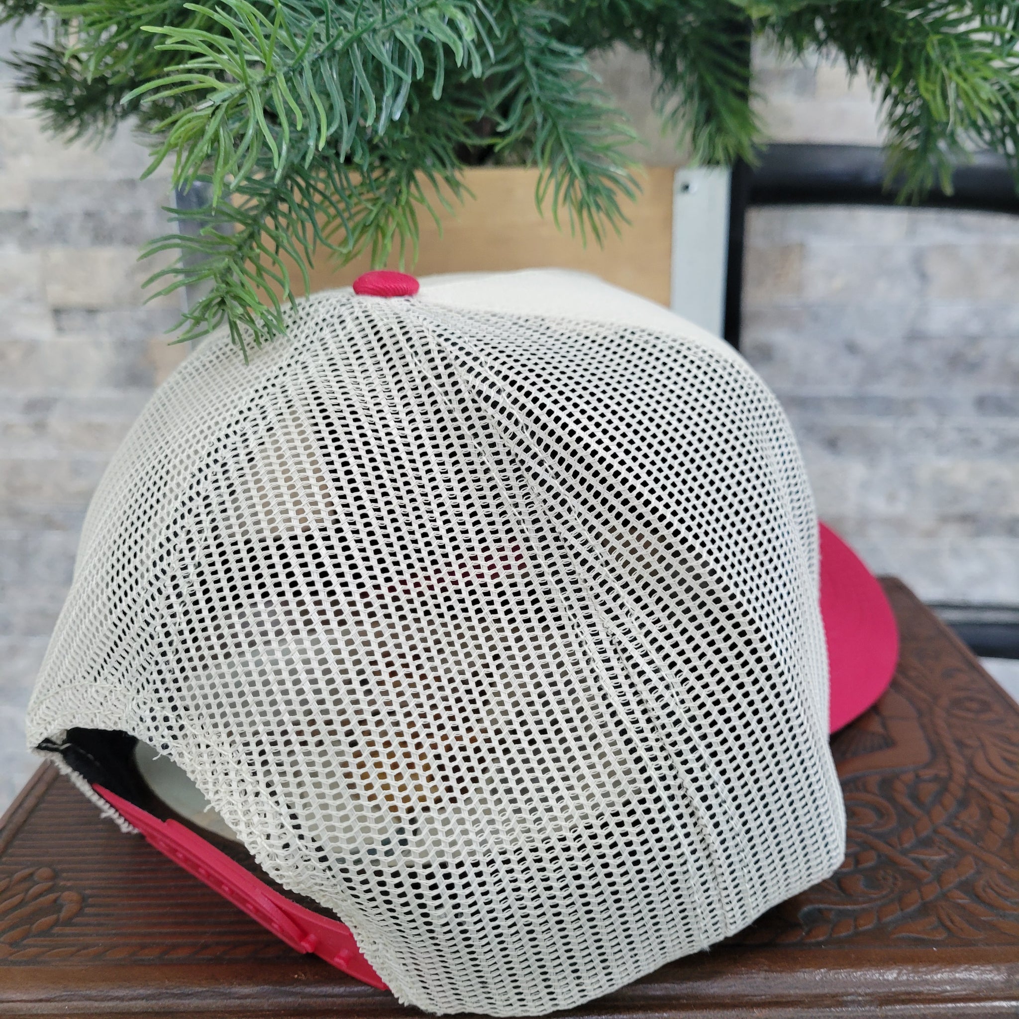 Featuring a 5 panel, mid profile structured crown with a contrasting rope accent.. Mesh sides. 3D embroidered saying. One size fits all, unisex in structure, with an adjustable strapback closure.