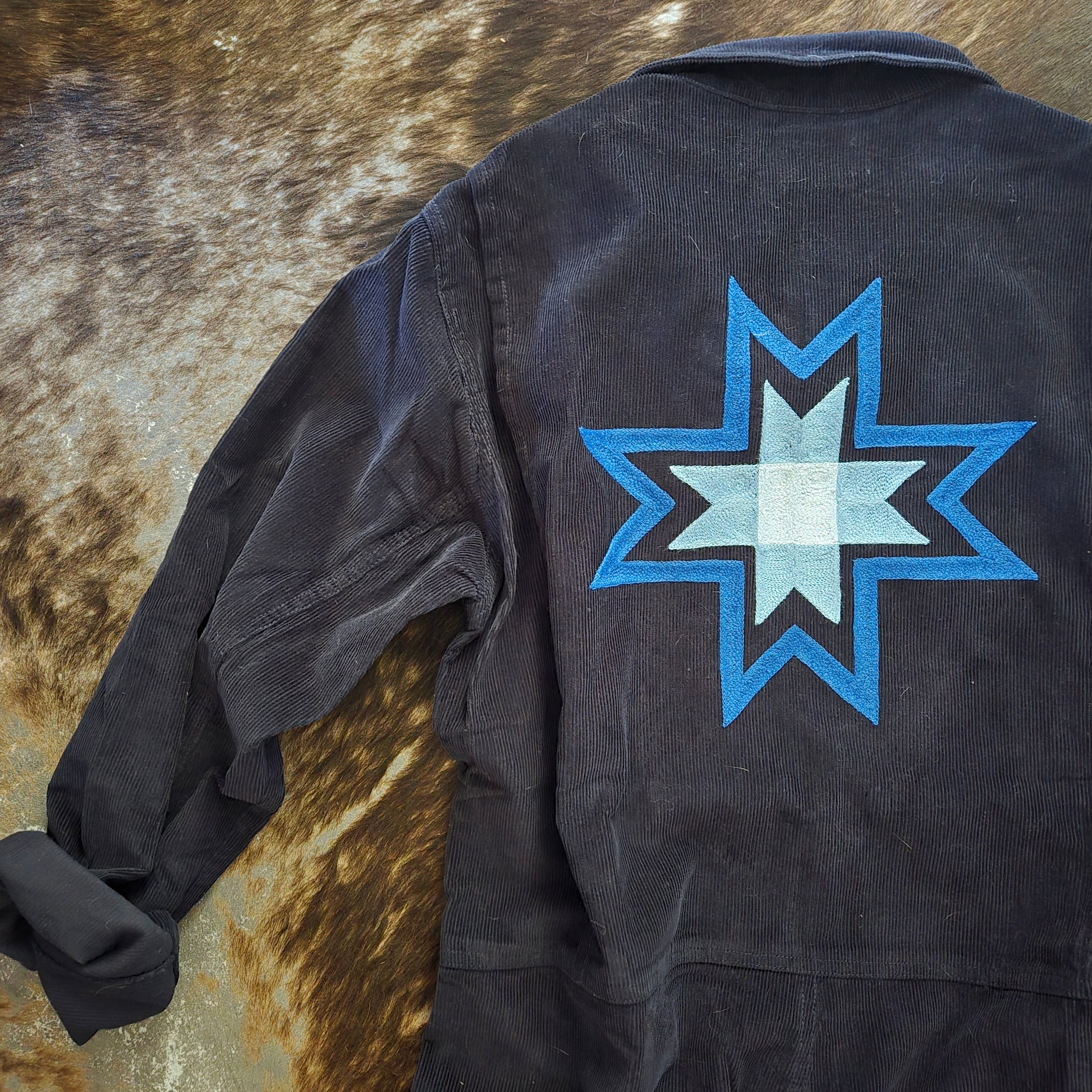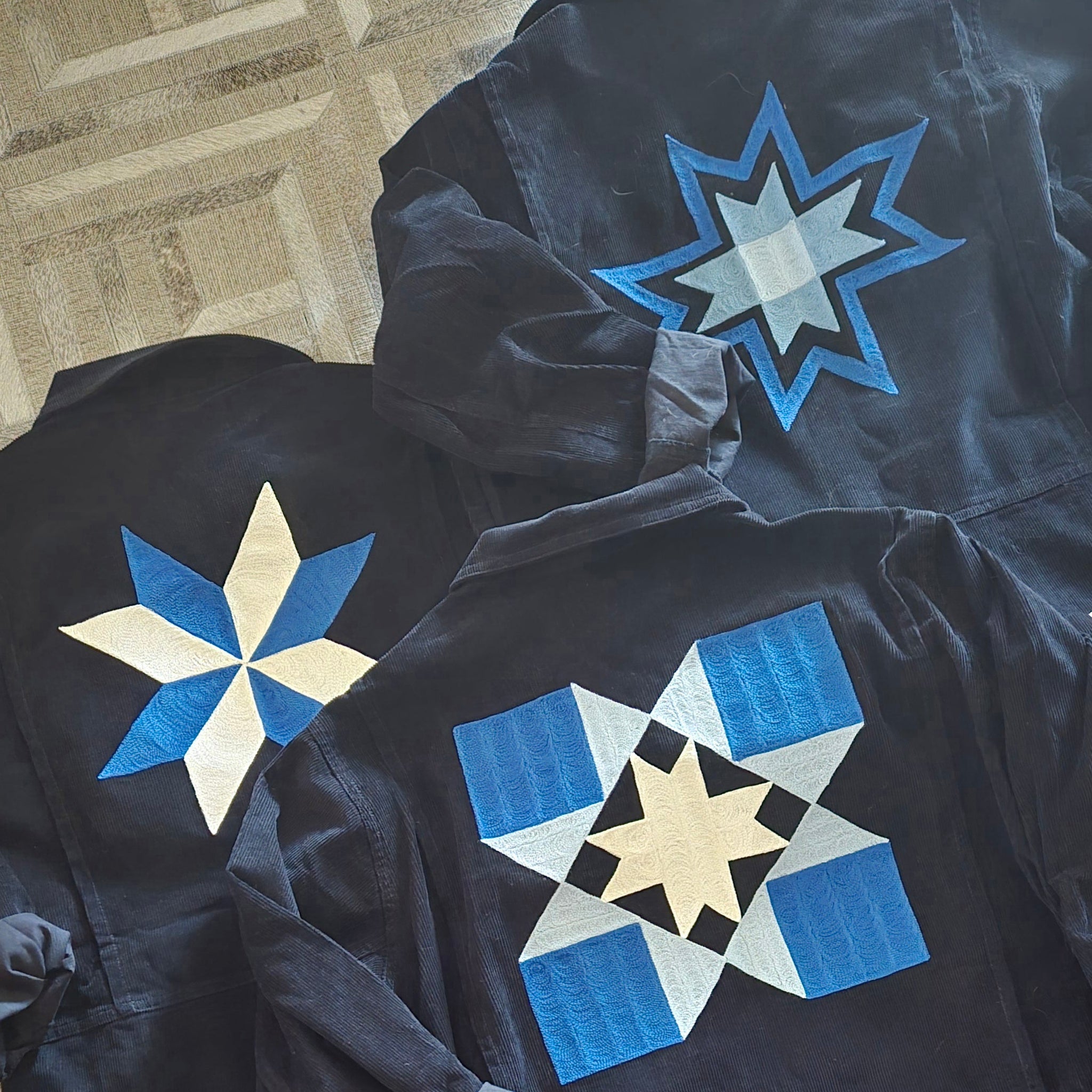 Artisanal craft meets workwear; we worked with our chainstitch partners to create a collection of one of a kind embellished Coveralls. A true Art to Wear garment that takes inspiration from Americana in the form of stitched barn quilt designs. Often found on the sides of barns in the Midwest, each garment features interlocking stars or pinwheels on the front chest and a unique design on the back.