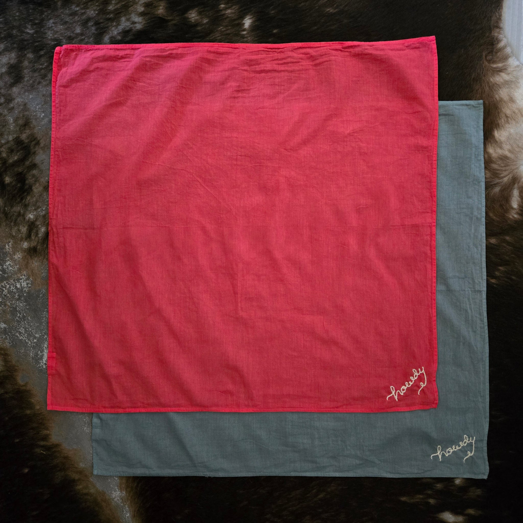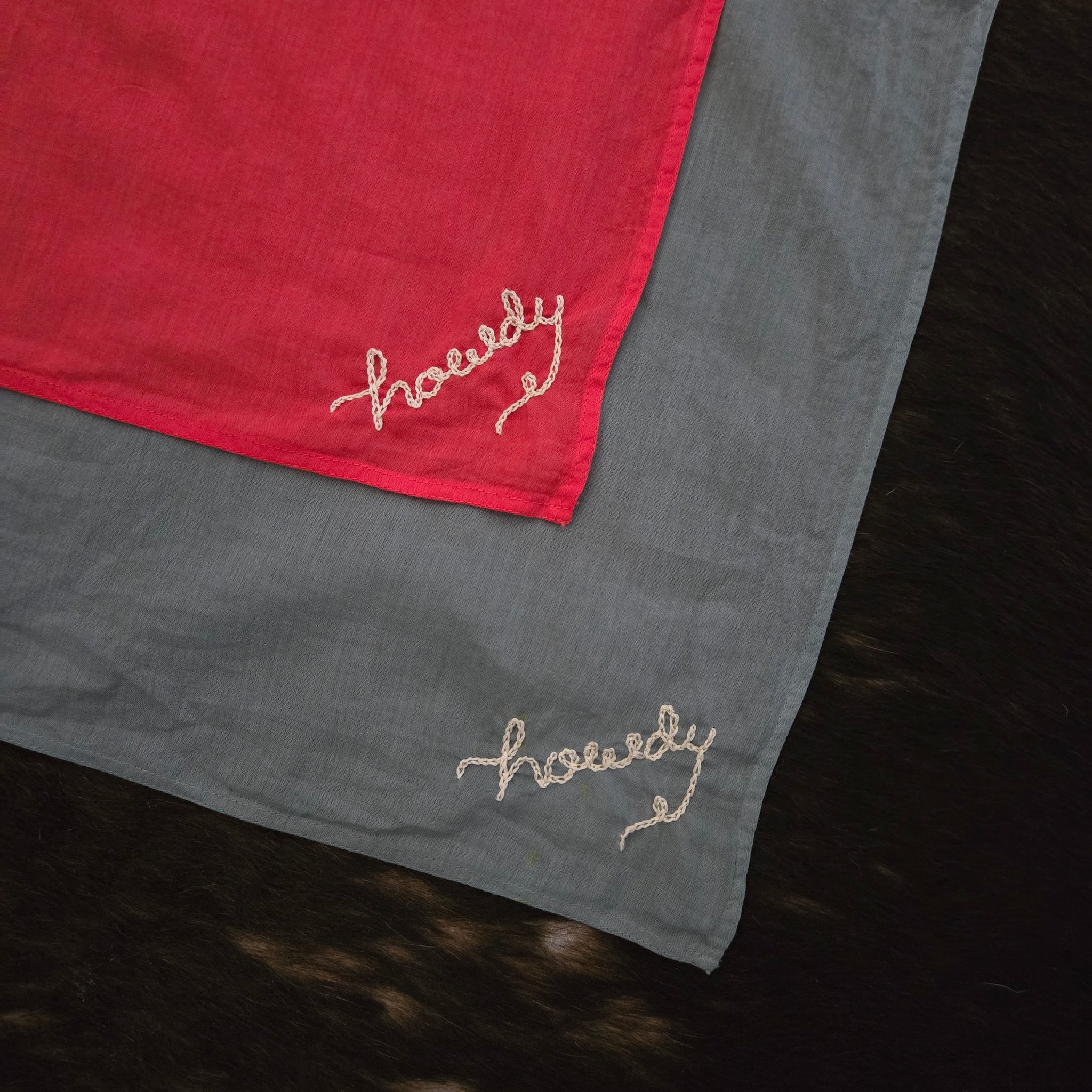 A simplistic but very special addition to our bandana collection. Artisan crafted and hand embroidered, this organic cotton style makes a perfect gift (and you'll want one for yourself). One corner is stitched with 'Howdy'...the obvious western greeting.