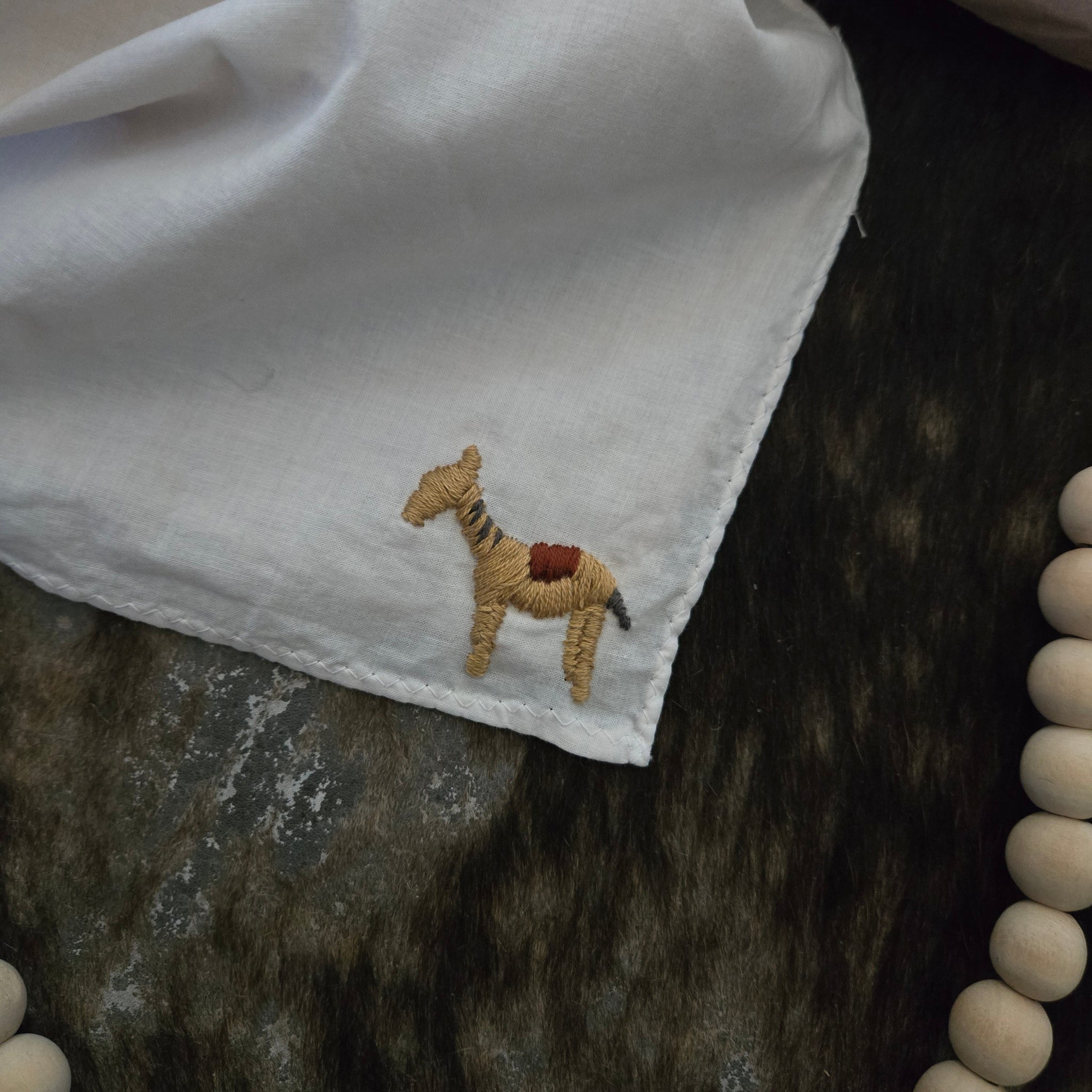 A simplistic but very special addition to our bandana collection. Artisan crafted and hand embroidered, this organic cotton style makes a perfect gift (and you'll want one for yourself). One corner is stitched with a pony (each one is unique). Very soft & prewashed.