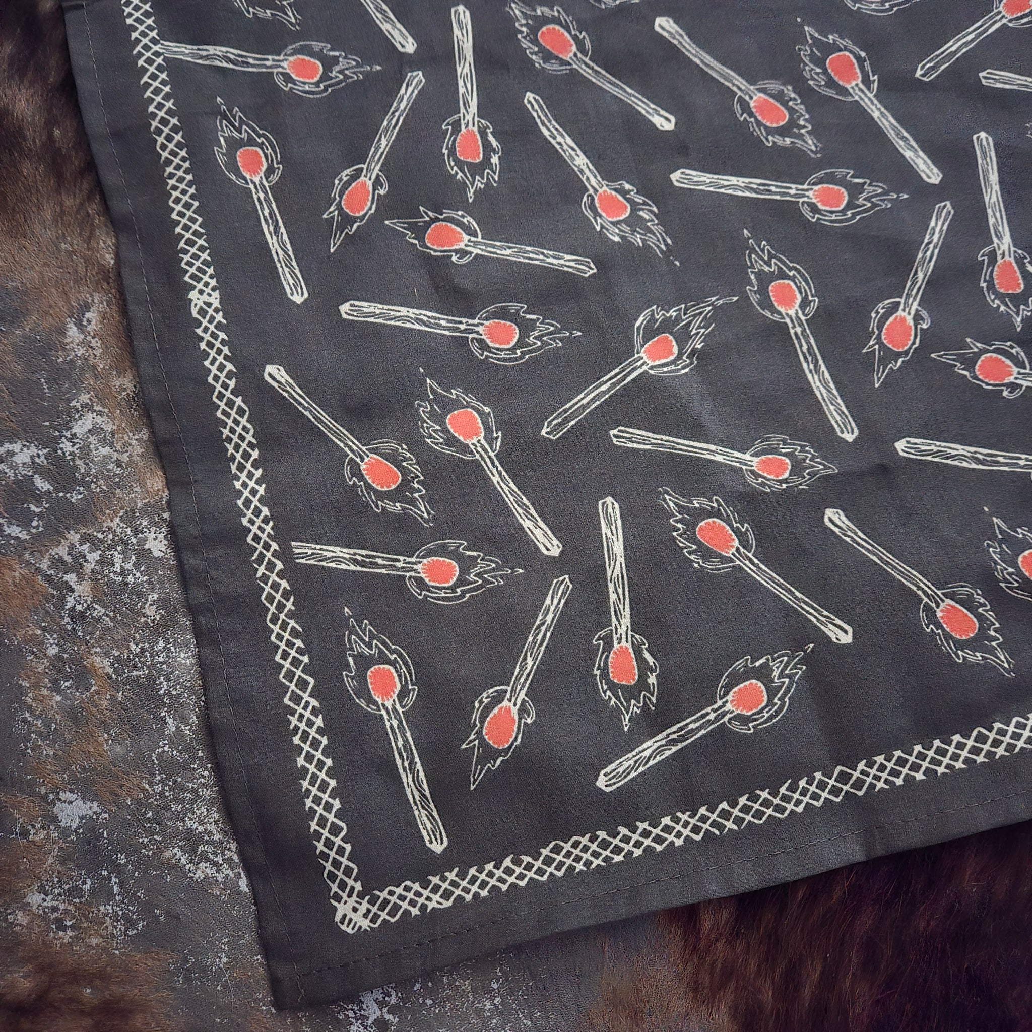 The winter signals the time for lounging around a warm fire. Our Matchlight bandana is screened with dozens of wooden matches scattered across the design. A special style for that makes the perfect gift.
