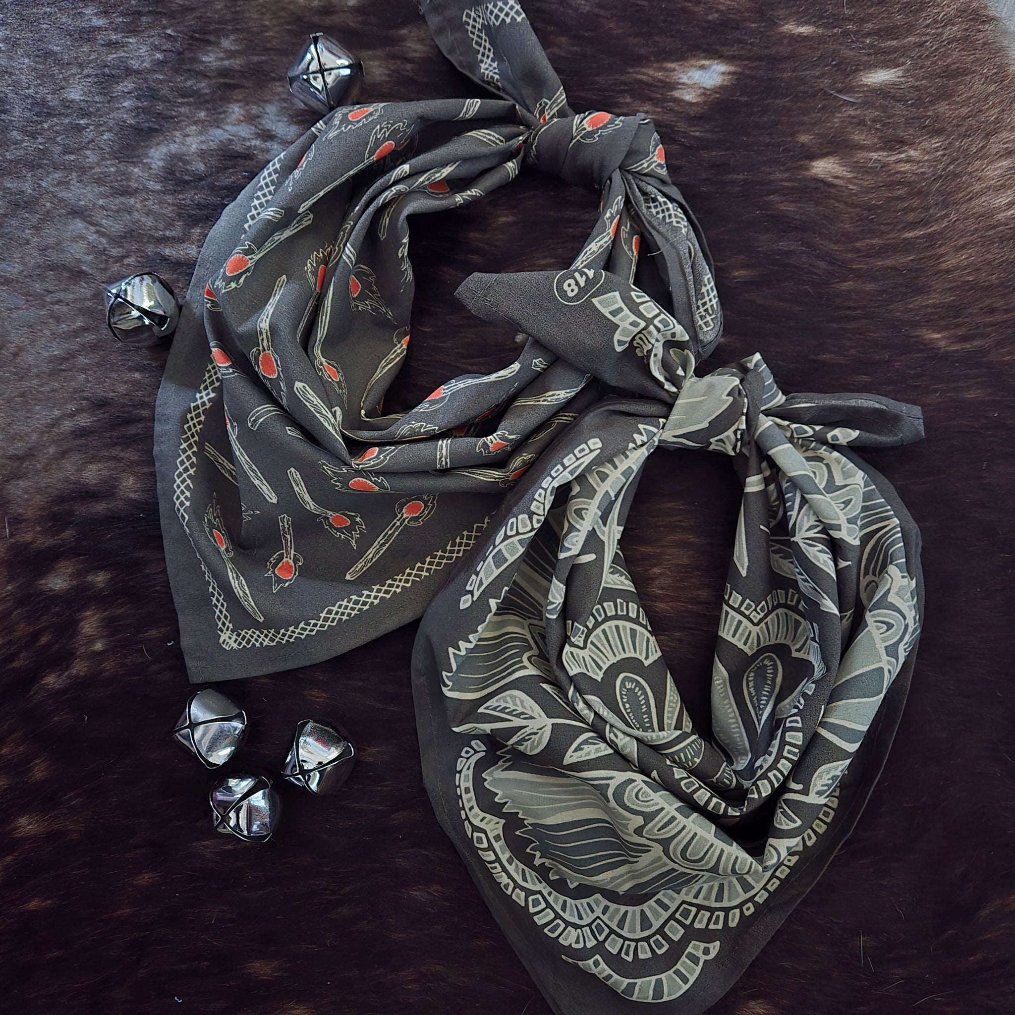 A bandana size of 22" x 22", crafted in soft cotton with turned and finished edges. One of the most versatile pieces you'll purchase...wear as a neck scarf, use as a shop rag, tie around your hair, frame on the wall, (we could go on forever). Available in  limited quantities.