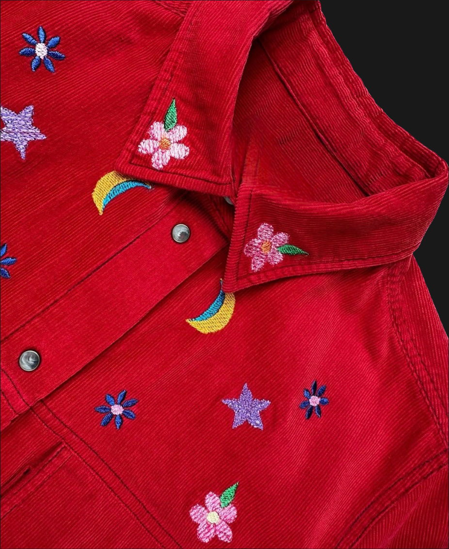 The Stars & Flowers style features embroidery on the front yoke, collar, and cuffs. Crafted in a cherry red cotton corduroy complete with western style lines and tortoise snaps. Two front flap pockets and turn back cuffs. Layer as a lightweight jacket or pair with the matching pants for a complete look.