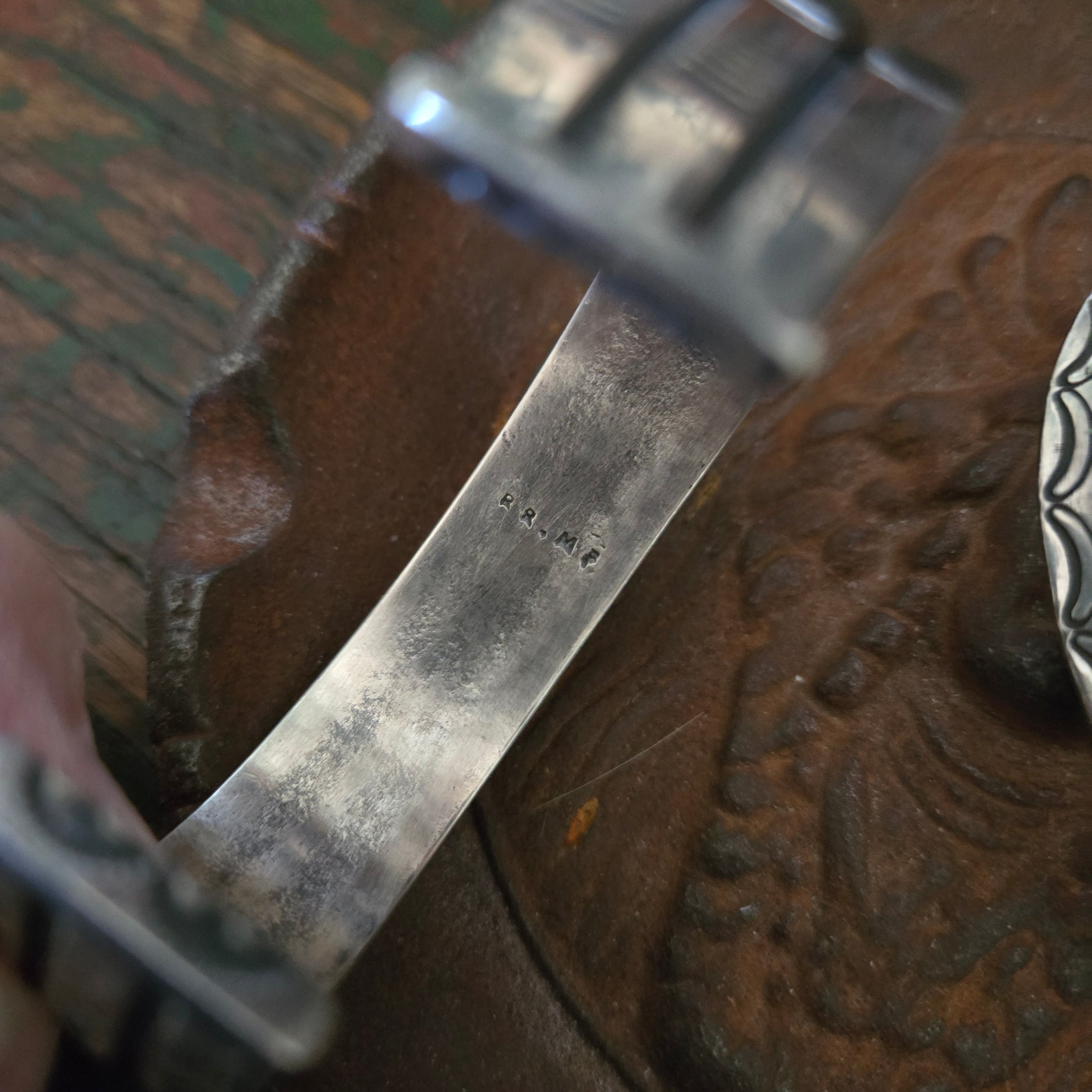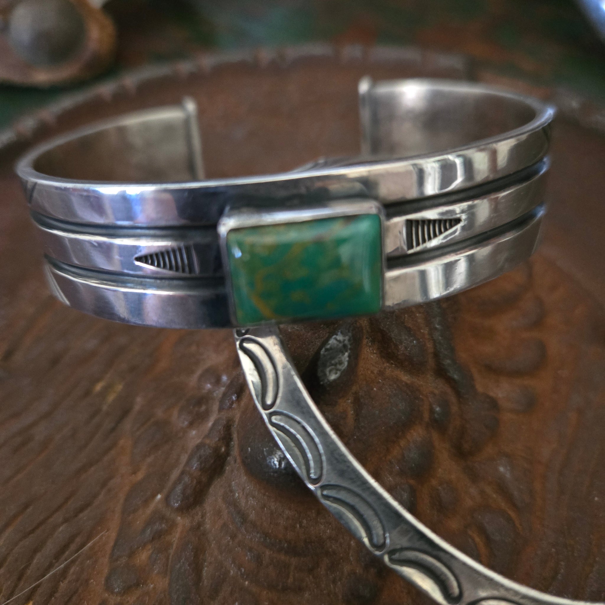 Crafted for us in Texas, this sterling silver Cuff style bracelet is anything but basic. Everyone needs at least one of these in their collection. Each piece is hand designed and stamped for individuality. Accented with a rectangular piece of turquoise. Great layered.