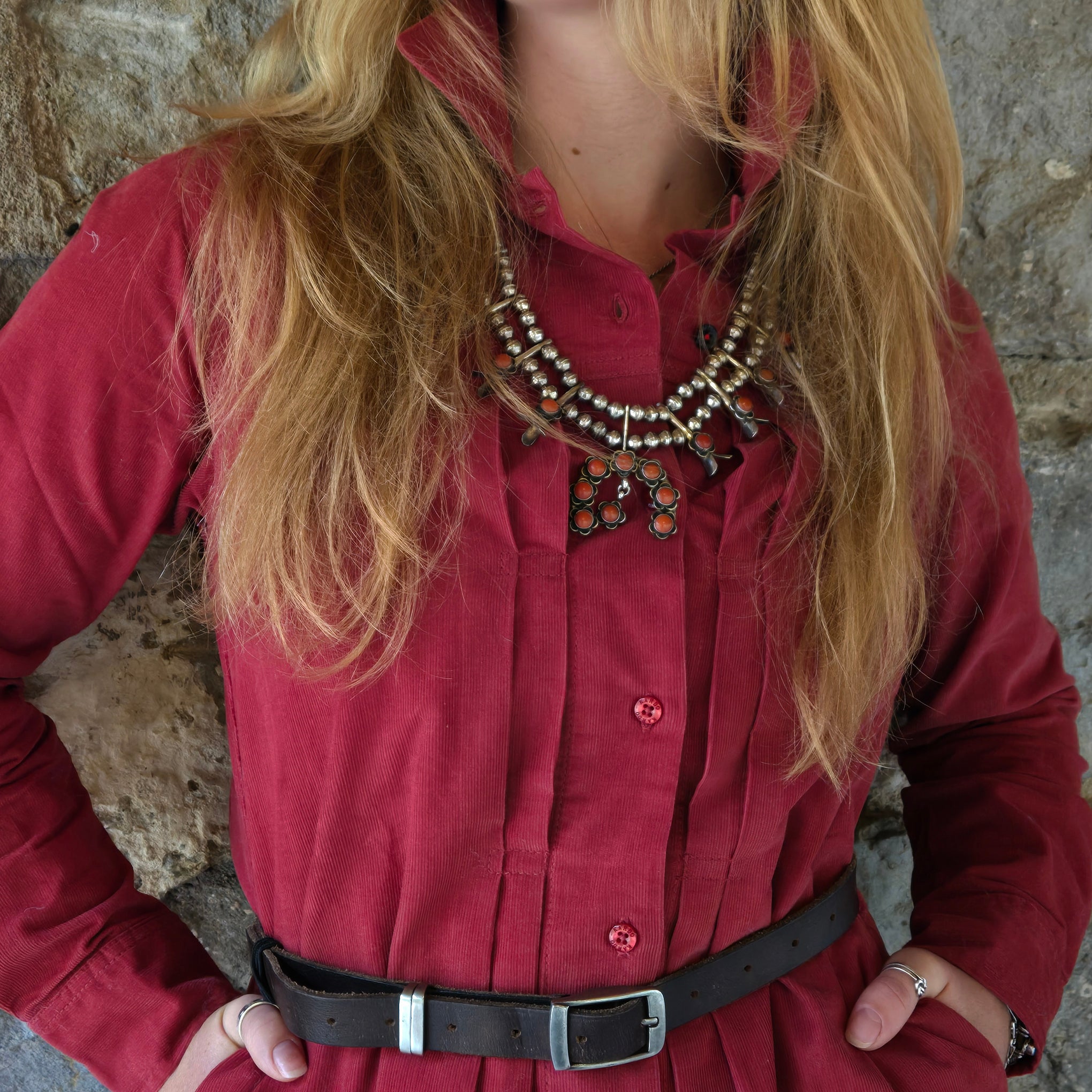 Versatile styles are our favorites and this one is all that. Our baby wale cotton corduroy dress also doubles as a duster. The pleated full button front has on seam side pockets (you asked for this!).There is a small embroidered floral patch on one arm. Add your own statement belt for a splash of special western chic.