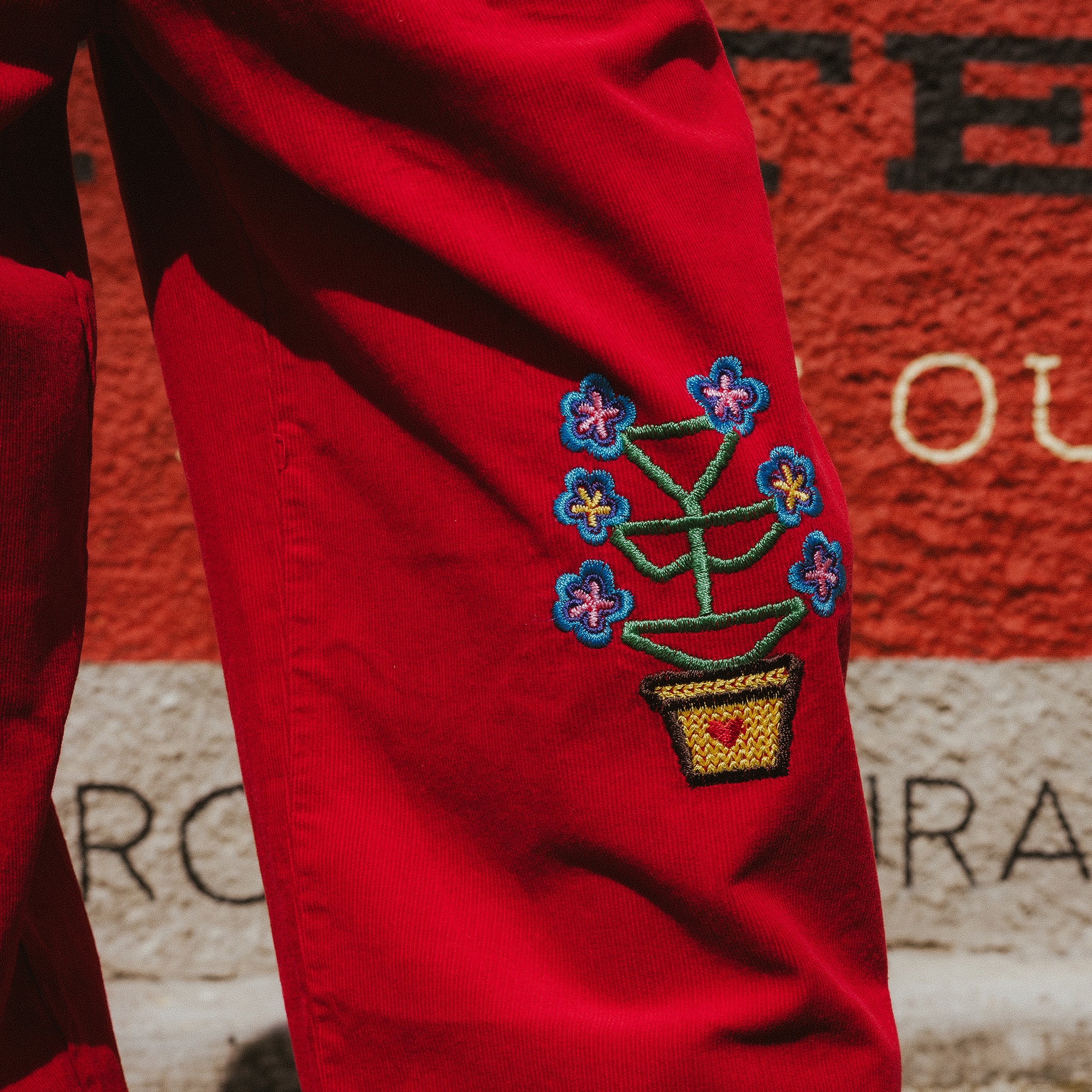 The corduroy embroidered pant features embroidery on the front legs. A pull on silhouette crafted in a drapey bright red cord with an elasticized waist. Side seam pockets and two backpatch pockets. The hems are finished to allow you to roll up...great with boots.