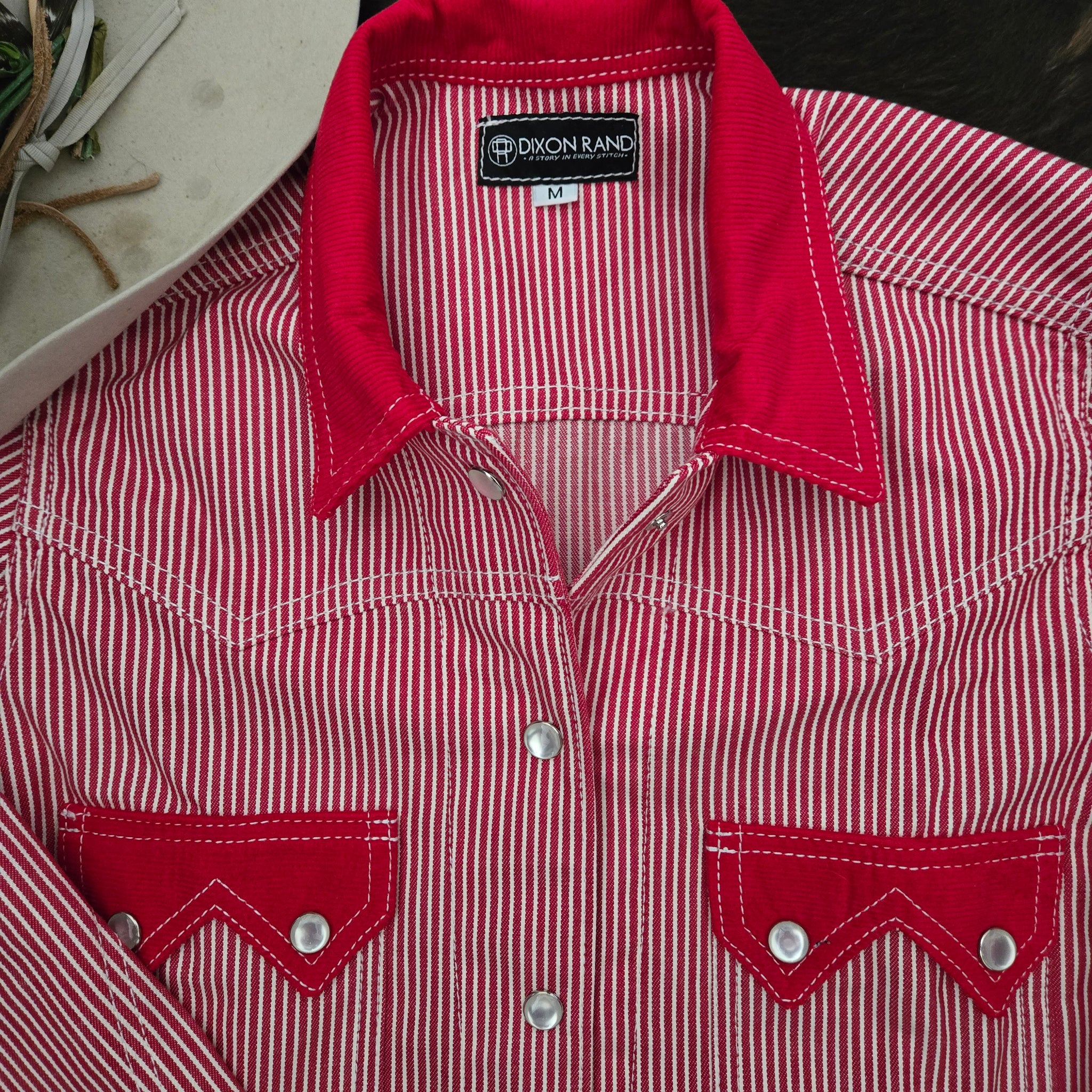 Dixon Rand's signature jacket style, designed for women. We took our bestselling Jack of Diamonds and cropped it a bit to fit a cowgirl's shape. Crafted in a soft red stripe denim with red corduroy accents on the collar and pocket flaps.
