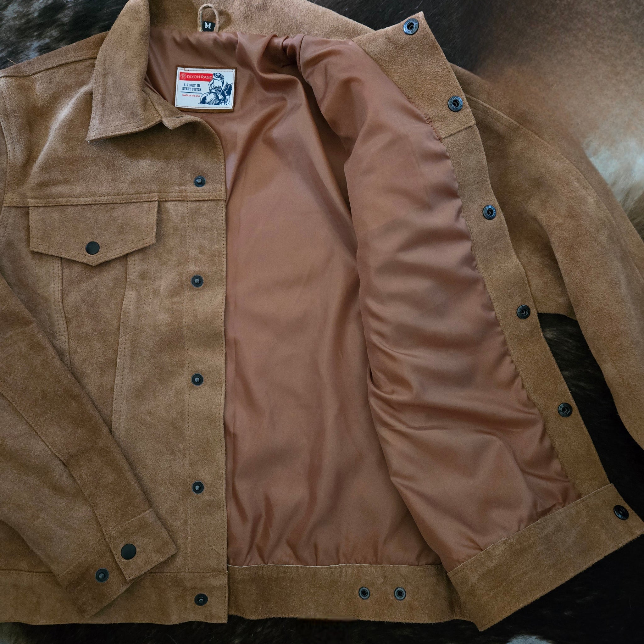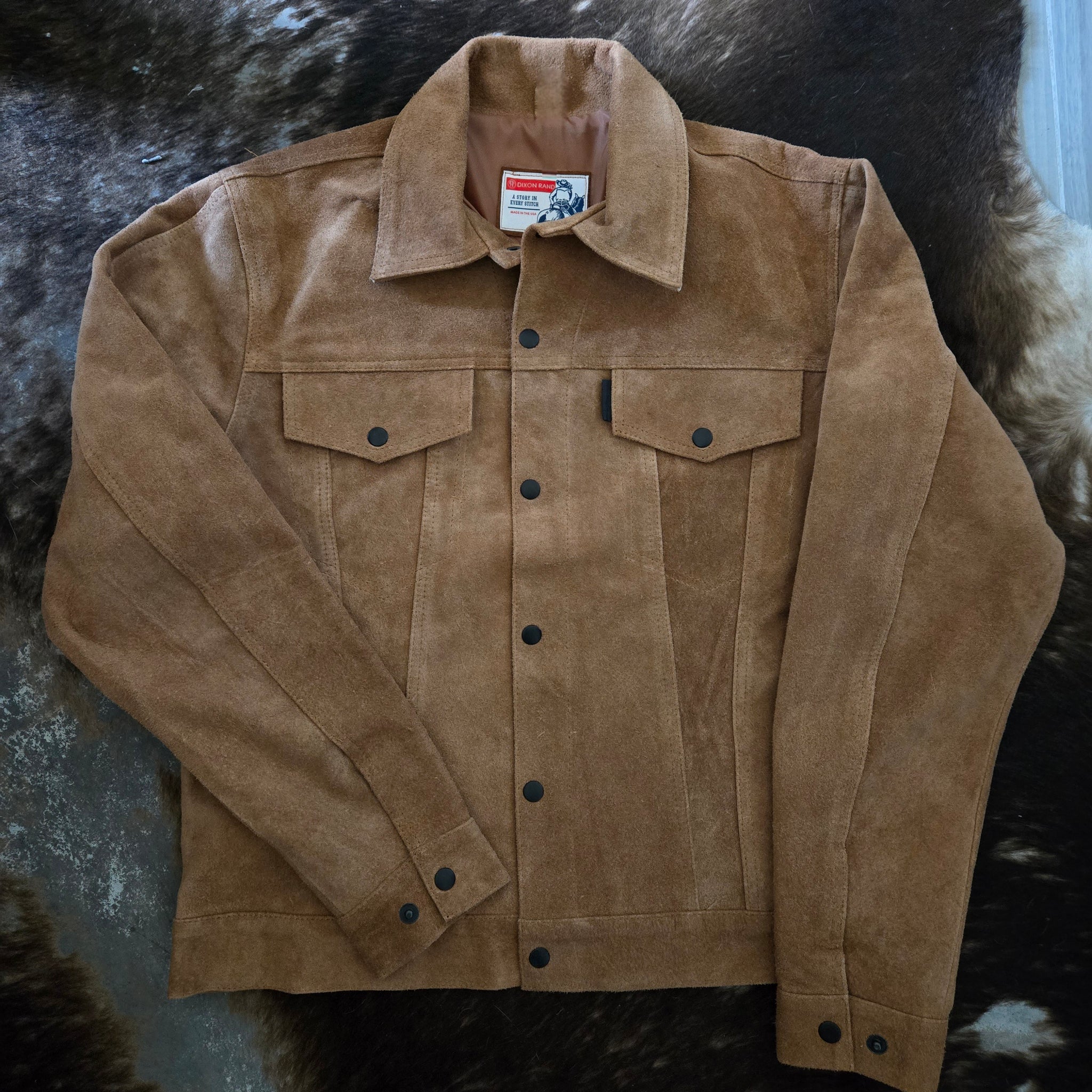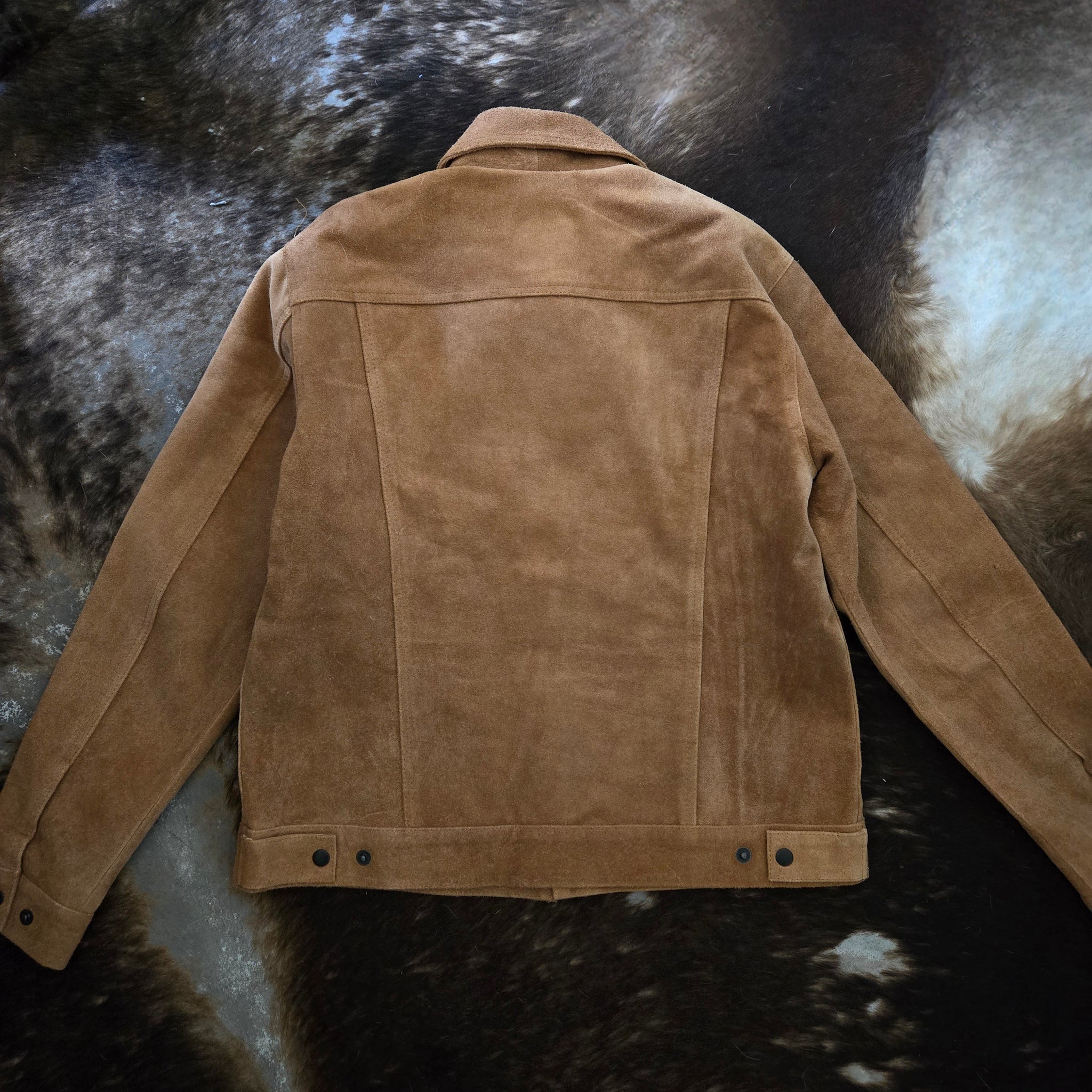 The iconic Trucker Jacket style crafted in a roughout texture suede. Perfectly crafted in a traditional whiskey color. Definitely meant for the Long Haul, this piece will break in and look better with age.