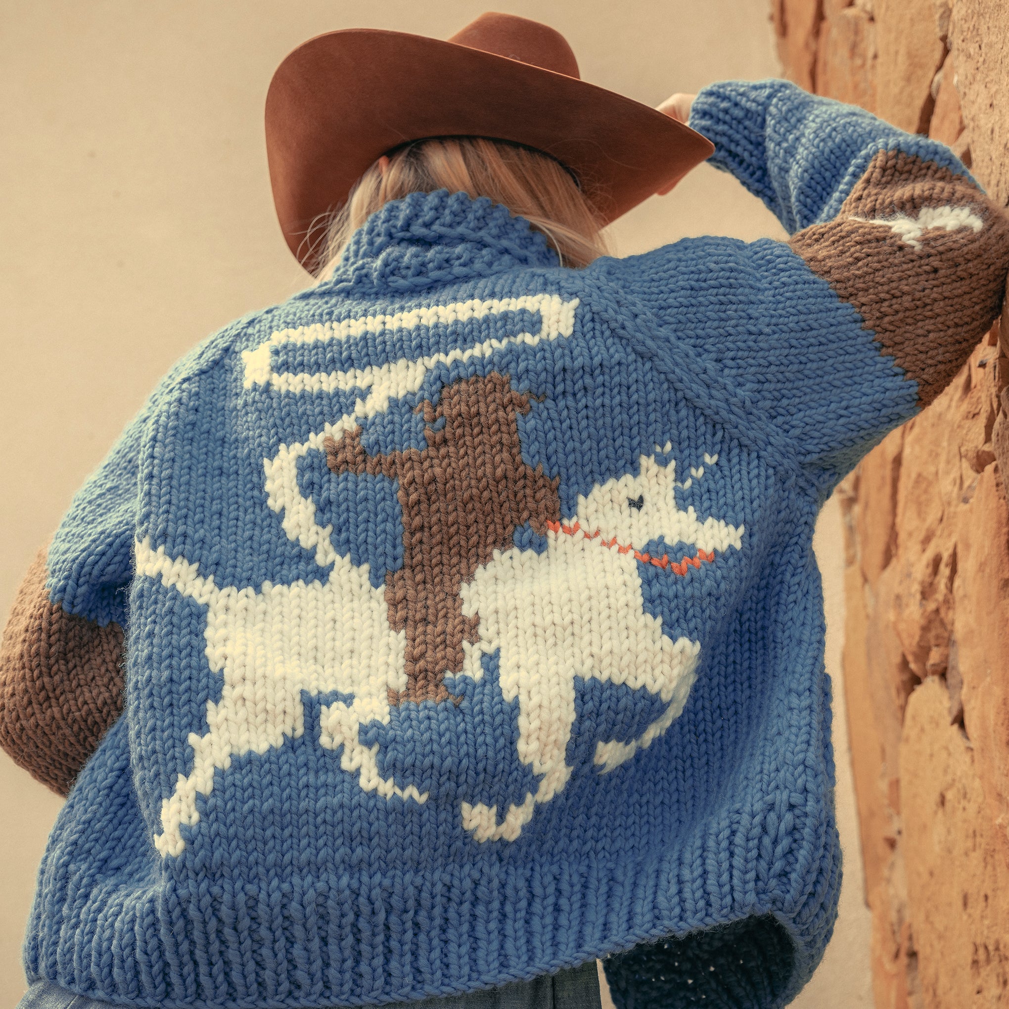 Born out of the brand's native Western Canada roots is the Cowboy cardi. We've expanded our Jane Rand Collection with the addition of some very special knitwear styles created by GoGo knitwear. The cropped cardis are a bit shorter making them perfect to pair with skirts and high waisted denim. A chunky handknit style with a shawl collar & raglan sleeves. There are pockets on the lower front of each side and the style is finished with hand made porcelain buttons. All over intarsia knit; hits at waist.