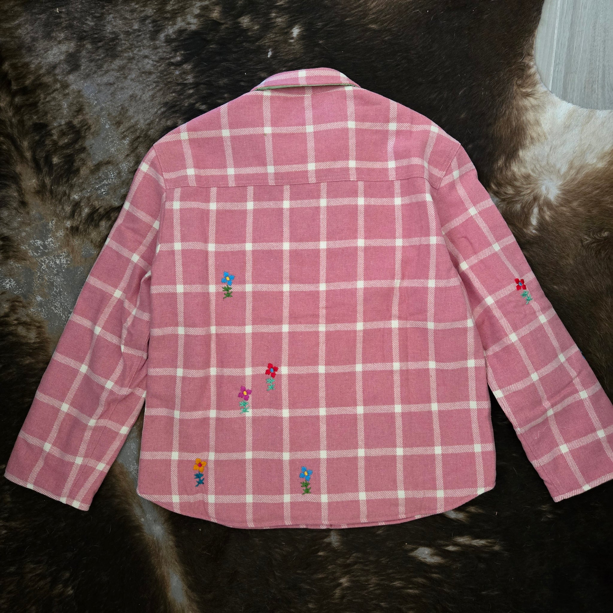 A true Art to Wear garment that takes inspiration from Americana heritage. A pink and white soft wool check is embroidered with scattered blooms. The full snap front has a patch pocket on the chest pocket and 2 inset pockets on the sides. Lined in a bright green stripe cotton.