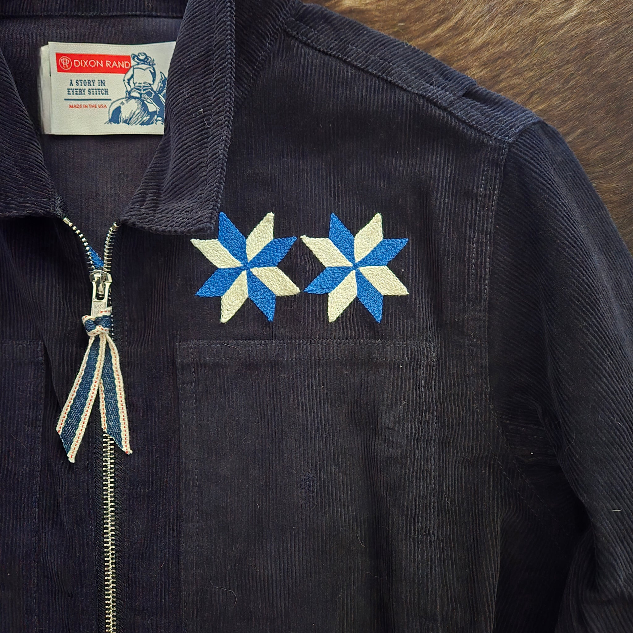 Artisanal craft meets workwear; we worked with our chainstitch partners to create a collection of one of a kind embellished Coveralls. A true Art to Wear garment that takes inspiration from Americana in the form of stitched barn quilt designs. Often found on the sides of barns in the Midwest, each garment features interlocking stars or pinwheels on the front chest and a unique design on the back.