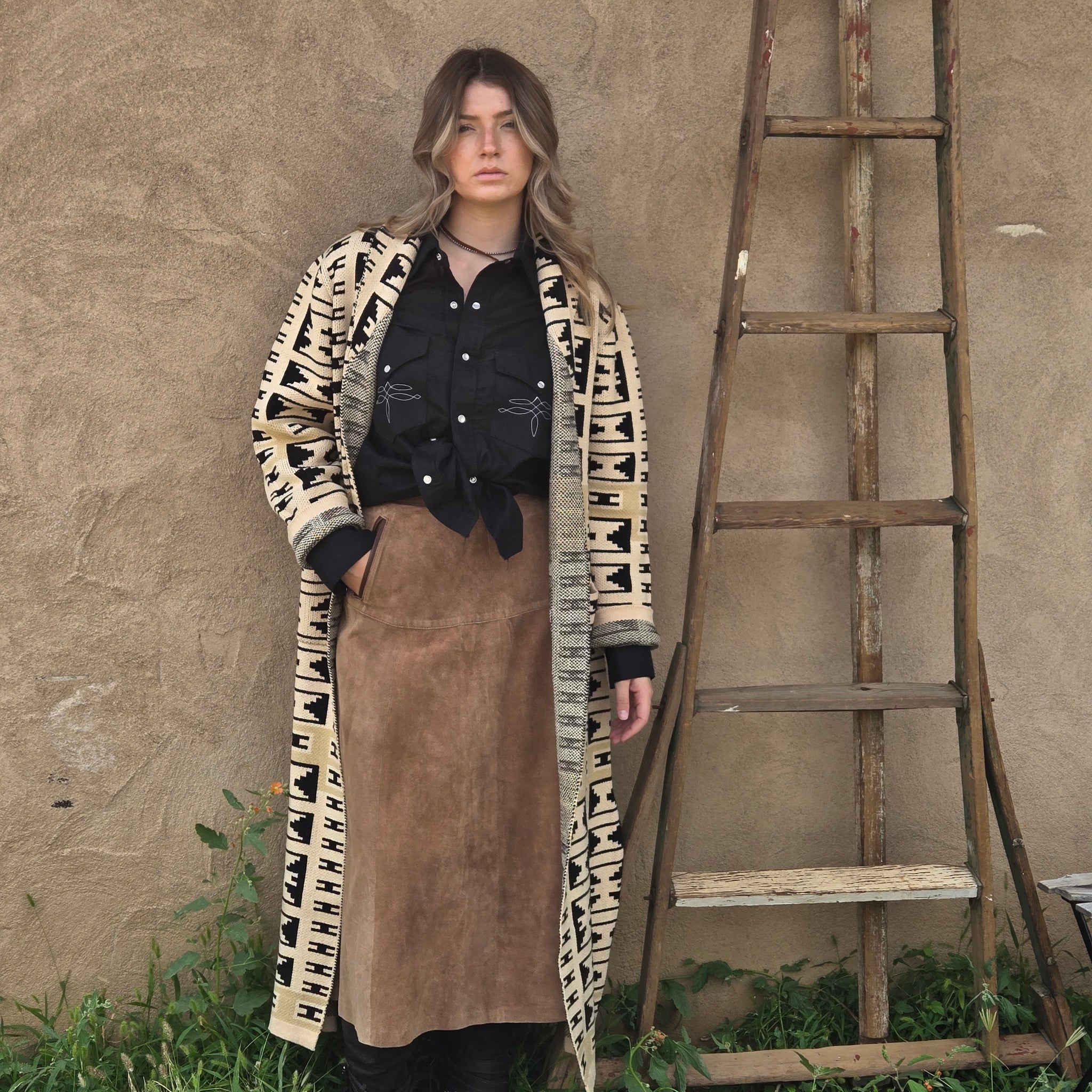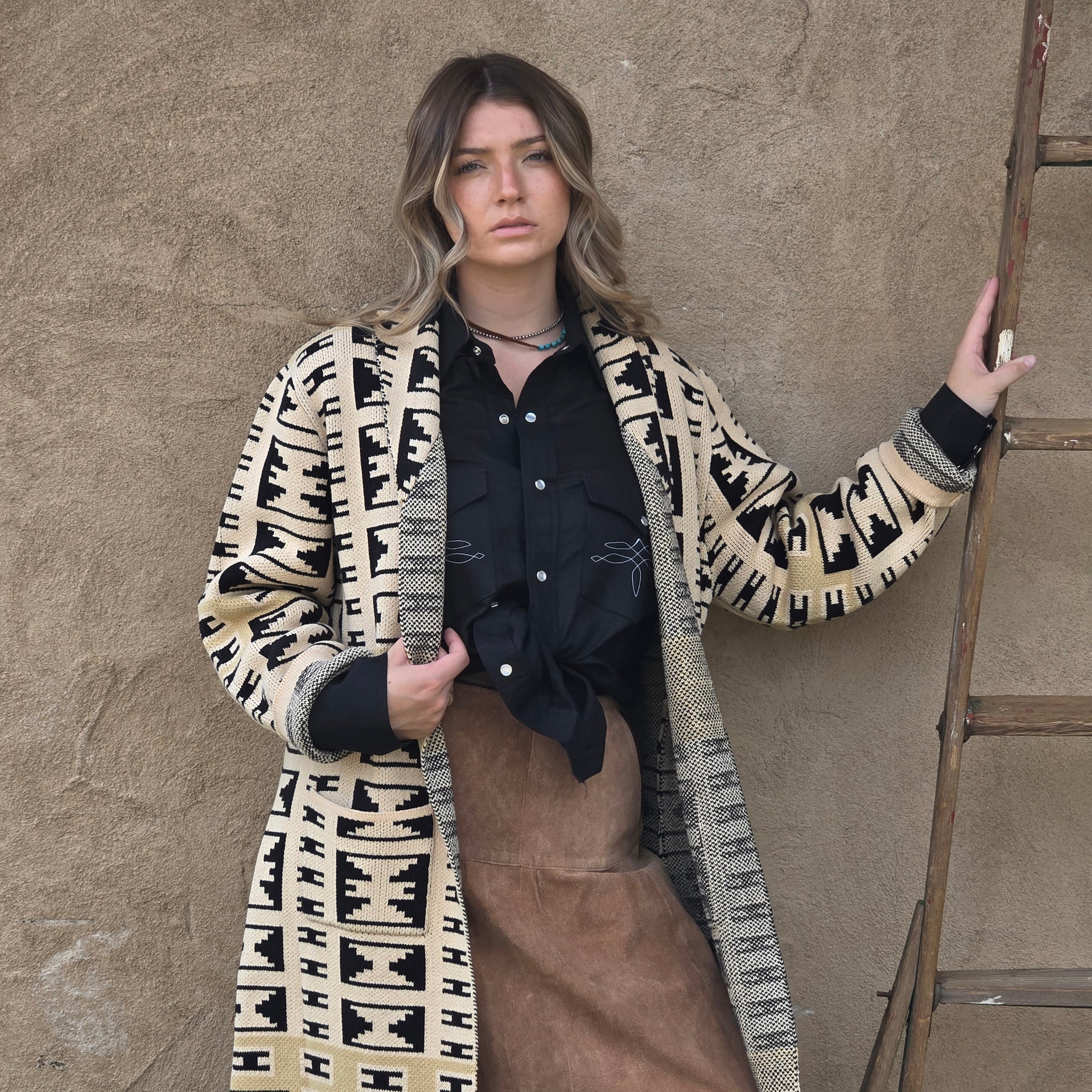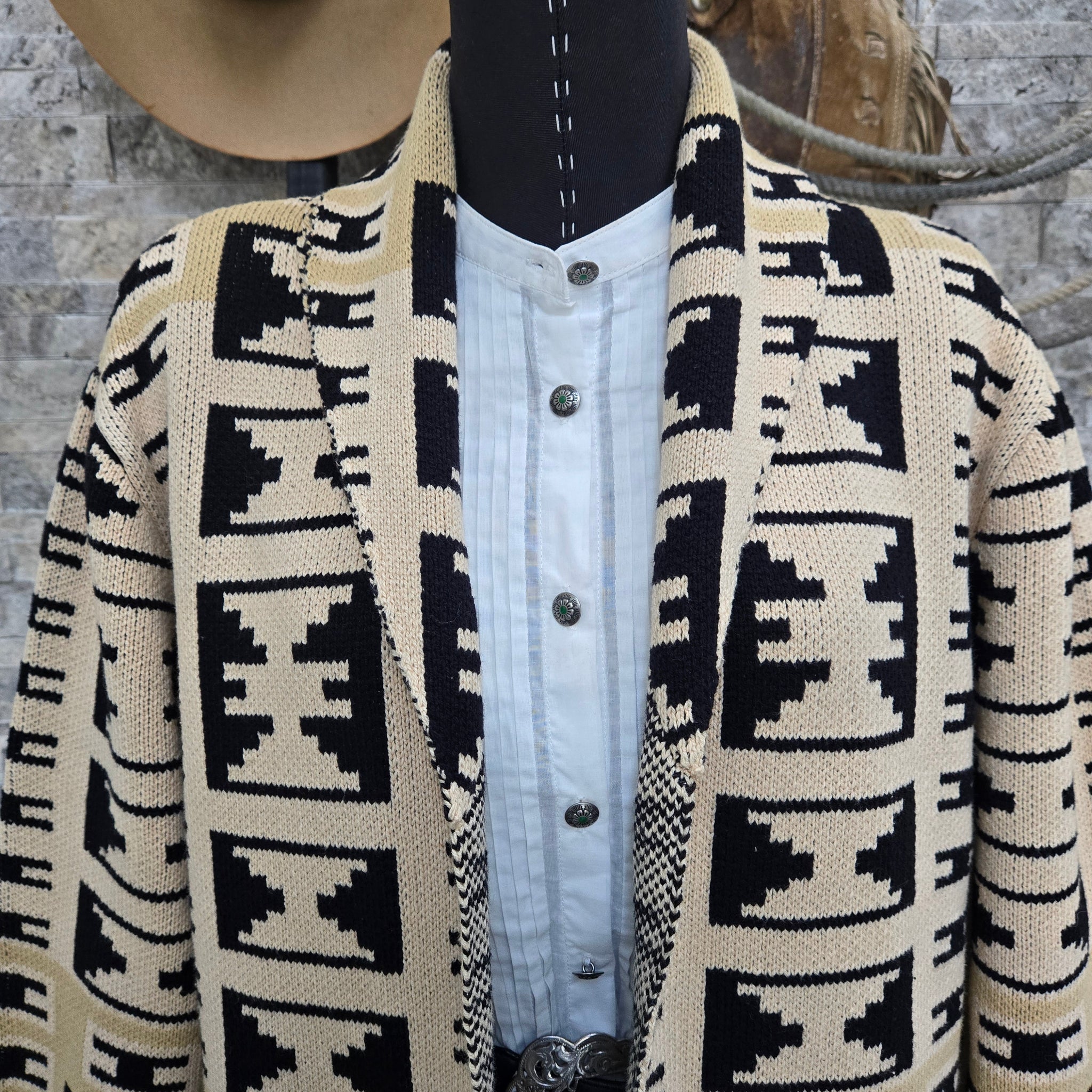 The cardigan as duster...a very special layering piece. An understated intarsia featuring a neutral native inspired pattern accenting the shawl collar design. The extended hem hits at low calf. With 2 front patch pockets and an open front, pair this with your best buckle set and a pair of cowboy boots.
