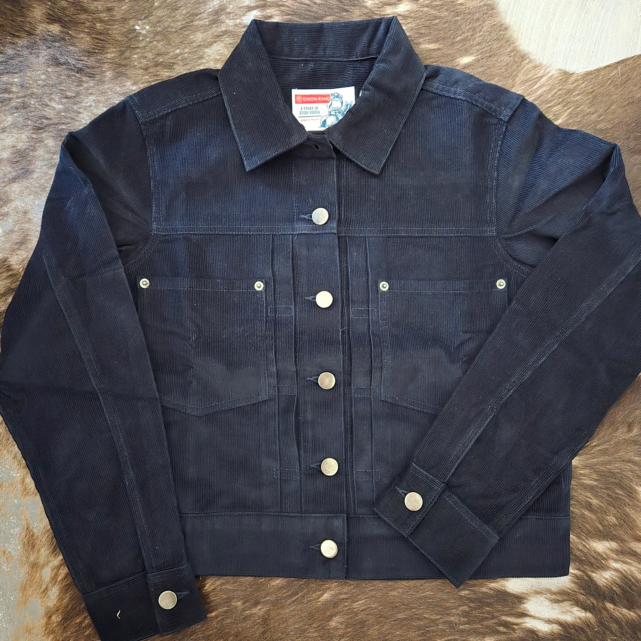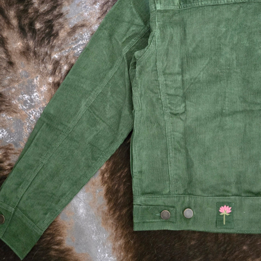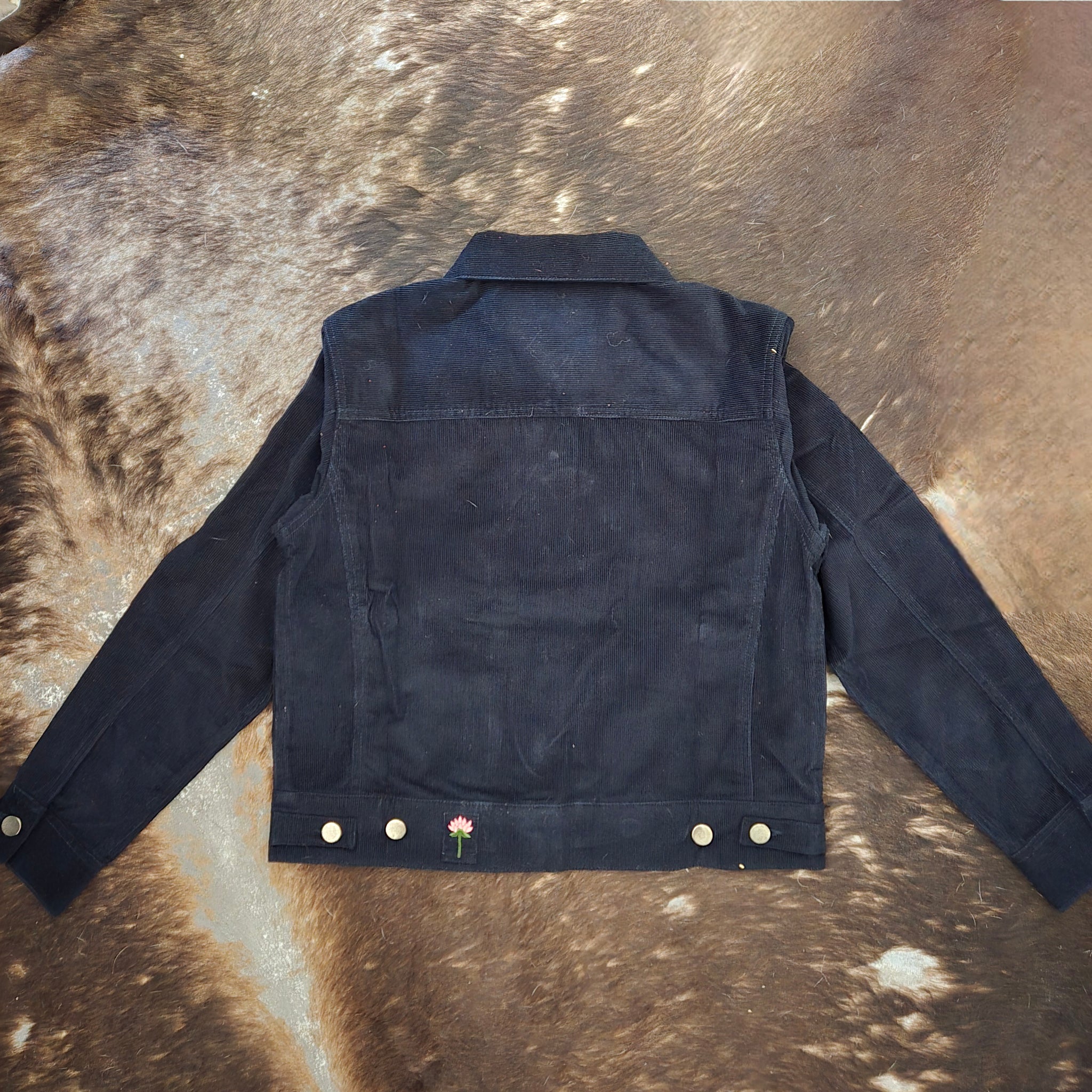 A classic but anything but basic. Our baby wale cotton corduroy truckers add the perfect layering style to your outfit. The pleated front is accented with 2 chest pockets and oversized nickel buttons. The waistband has a small statement embroidered floral patch; adjustable waist tabs.